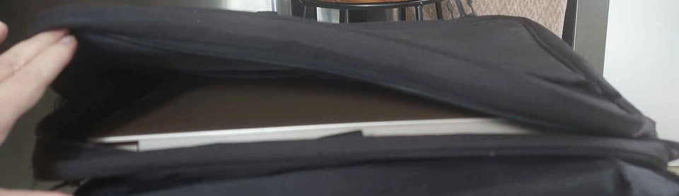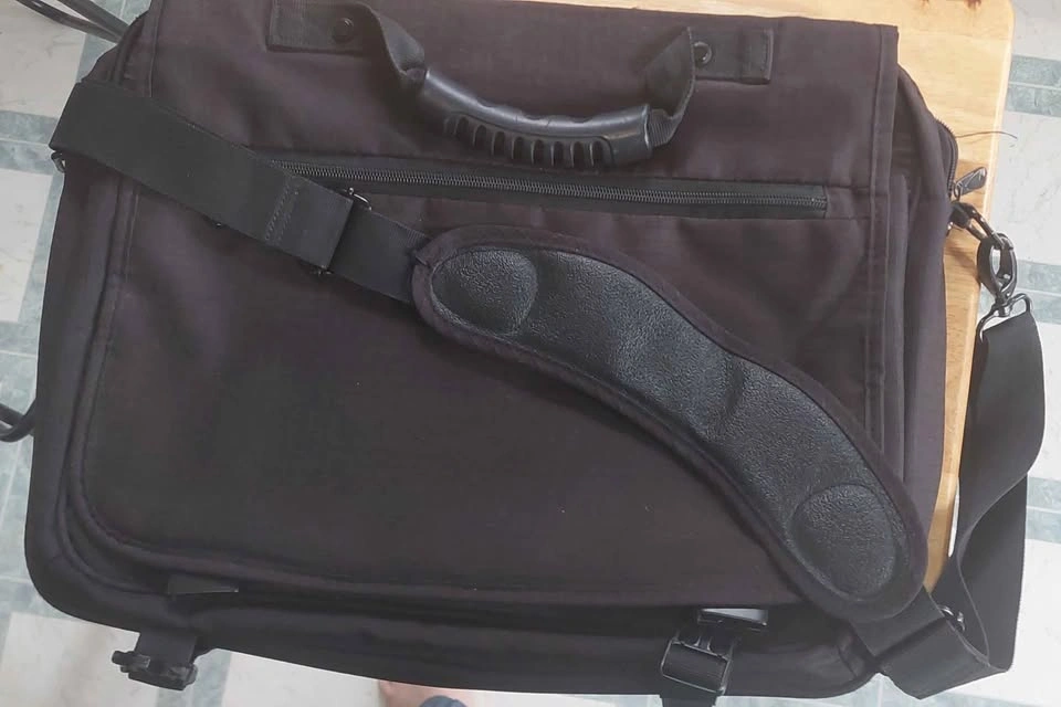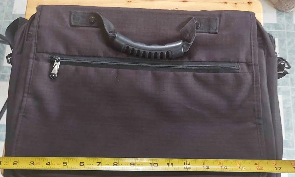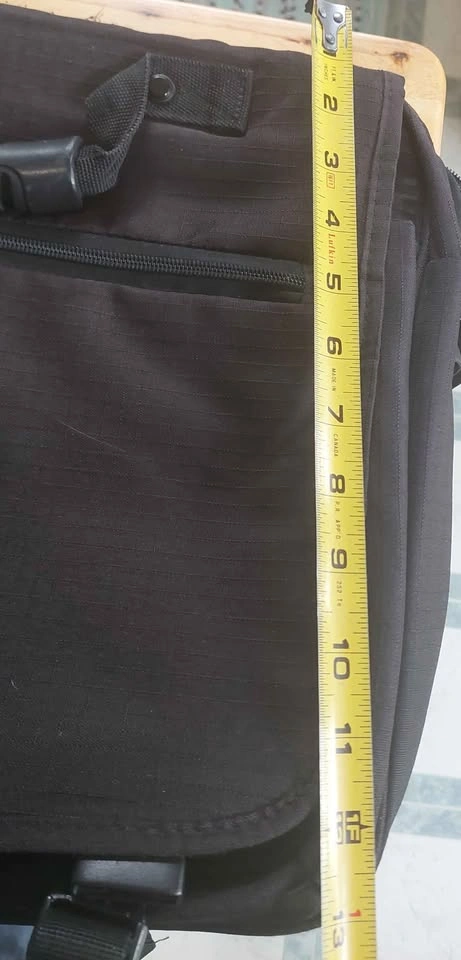 10Laptop bag suitable for laptop up to 15". Durable and waterproof rip-stop nylon fabric Zippered compartment on front flap, space on back for papers etc. Velcro-close compartment with space for pens/ pencils, paper, and cell phone. Main compartment has padded central divide and two mesh pockets. Messenger-style padded shoulder strap as well as regular handle Buckle closures on front flap. Good condition. Pick up Langford area near Happy Valley Road. Cash only please.