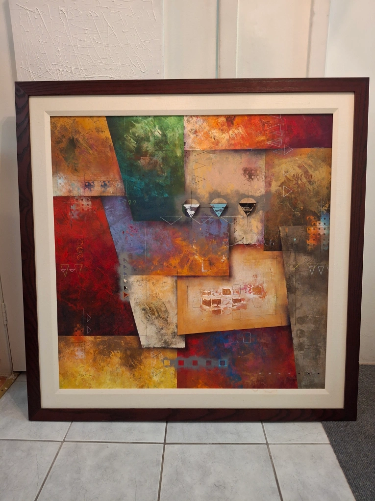 Large framed abstract painting. Oil on canvas. Multicoloured geometric shapes and patterns. Deep colours and textures. Ready to hang. Artist: Serafino Catallo. 3ft x3ft