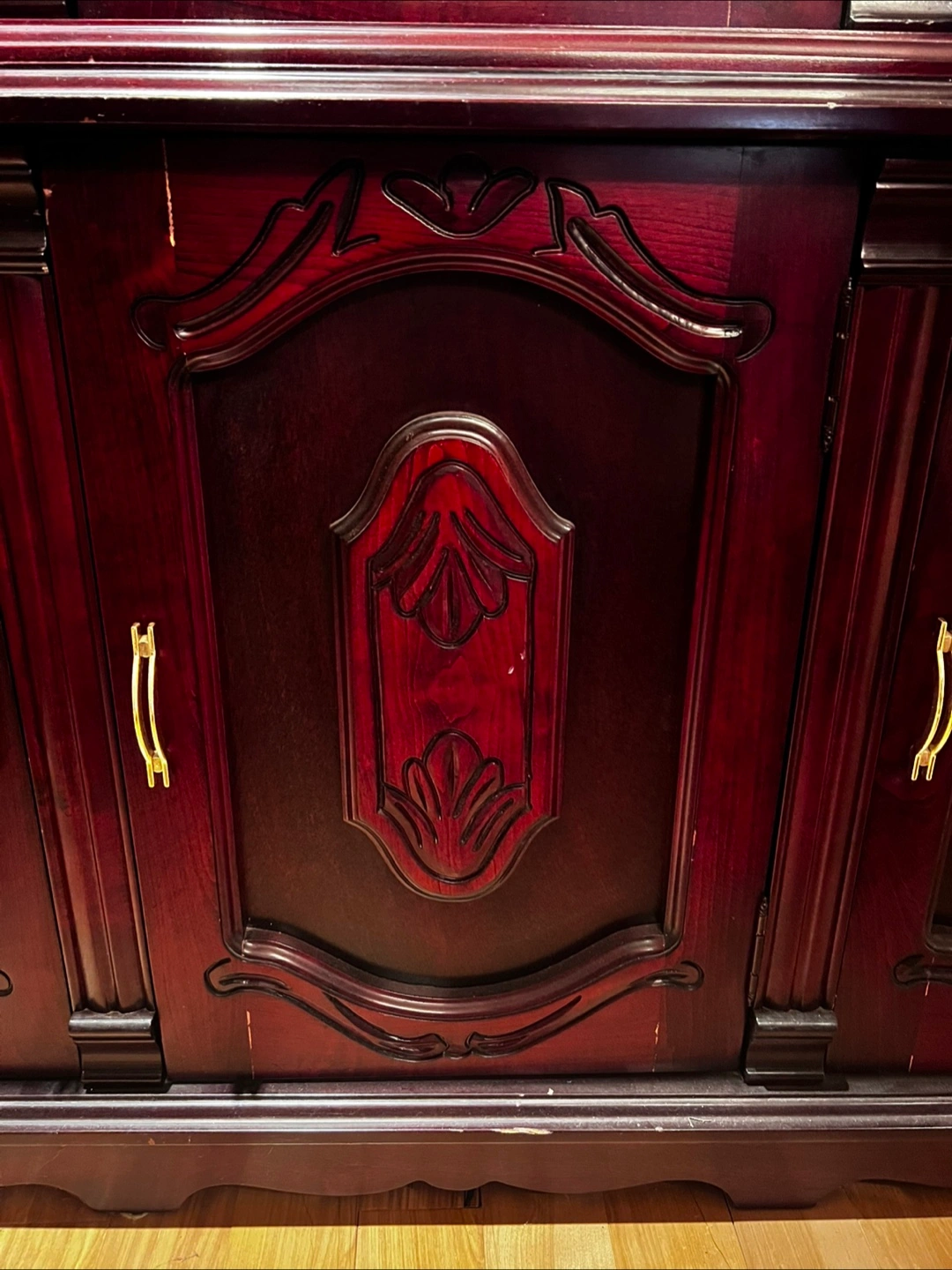 Large, dark-stained wooden china cabinet. Features glass-fronted display cabinets and lower storage. Intricate carvings and gold-toned hardware. Excellent for displaying collectibles or storing dishes. Buffet Cabinet unit - 76 wide x 20 depth x 82 height Solid wood cabinet with 3 cupboards and 3 glass doors Smoke free and pet free home. Smoke free and pet free home. Cash or etransfer payment. Pickup: Abelard ave near Steeles and McLaughlin in Brampton Moving sale: no offer refused