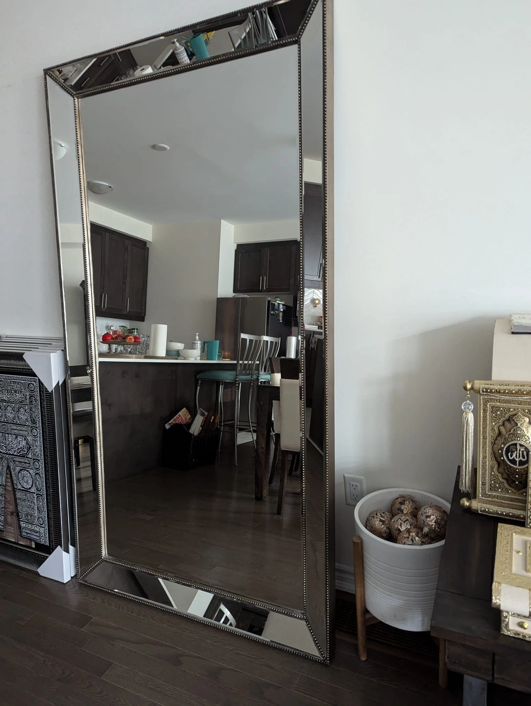 Here's a large wall mirror with a beveled edge. It's in great condition and ready to brighten up your space! It's a statement piece that will add a touch of elegance to any room