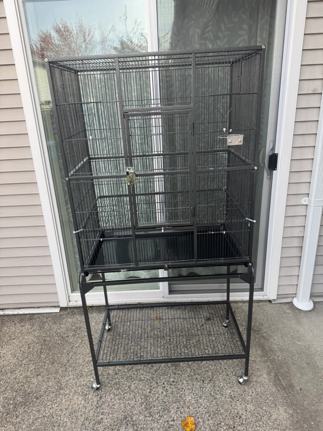 47Selling a large bird cage in black. It comes with a stand and is in good condition. Perfect for your feathered friend!