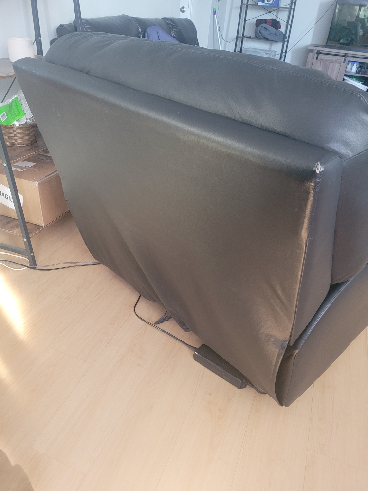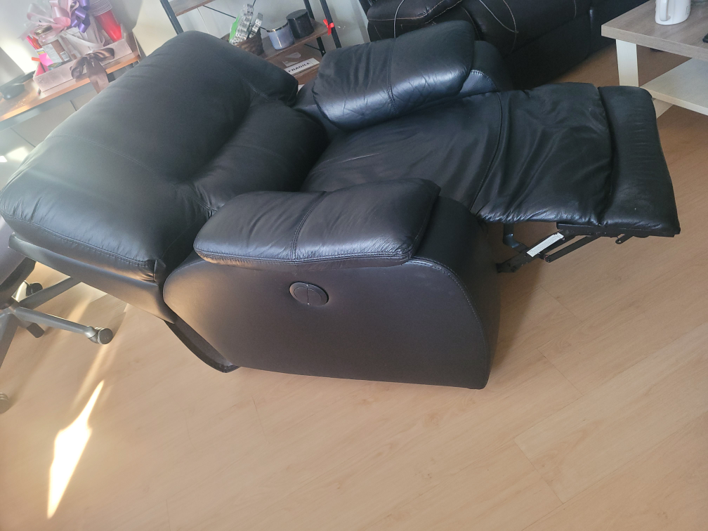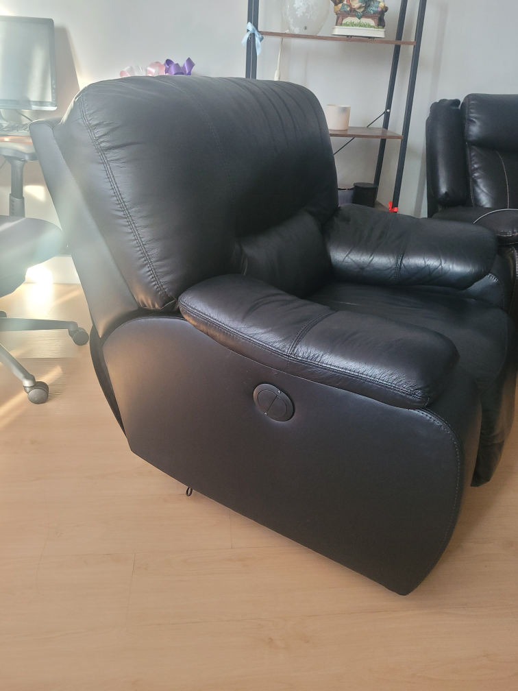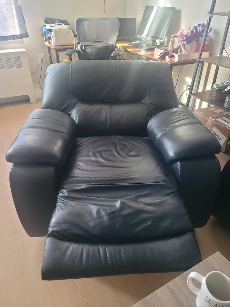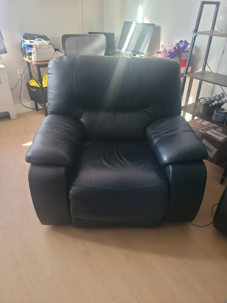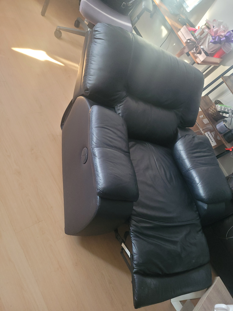 26it is an older Black leather electronic recliner, it's very wide and a decent size all together. there are a few nicks in it, but nothing major to decrease the value of the chair (i have placed a picture to show the nick on the back of the couch). it plugs into the wall so it is able to recline and still works perfectly with no issues. perfect chair to cuddle up in with blanket and a pillow and take cat naps in. Needs to go before the end of May. reason moving - getting new furniture.