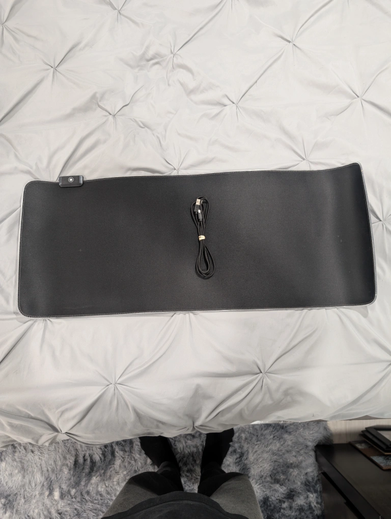 18Large black mousepad with stitched edges. Includes USB cable for a built-in LED RGB light on the top left corner.
