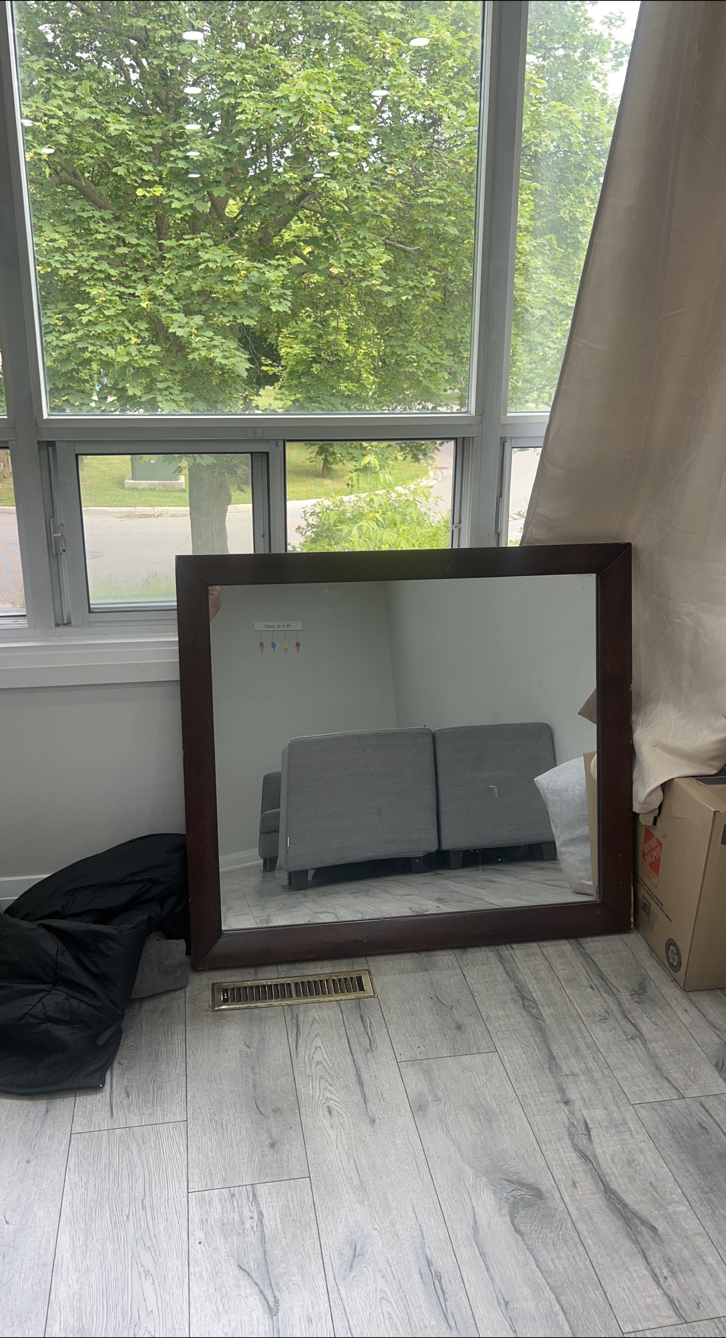 Mirror has a dark brown wooden frame. Rectangular shape. Very well suited for any bedroom or entranceway, the mirror would brighten any room with natural light reflecting off its surface.