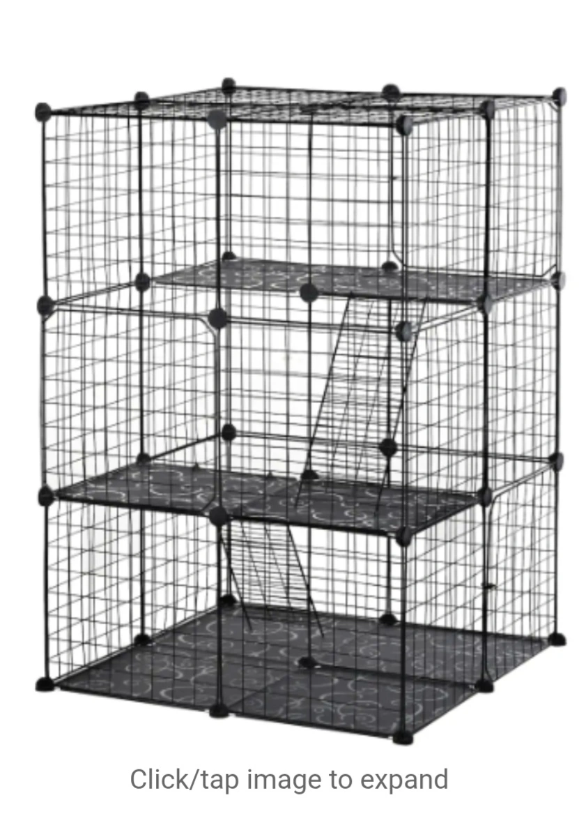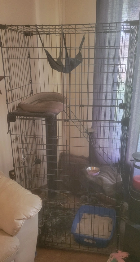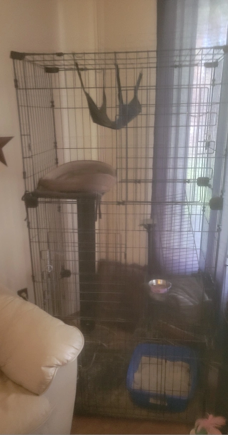 Selling a large cat cage/playpen. It's in good condition and provides lots of space for your furry friends to play and relax. Comes with multiple levels and a hammock!