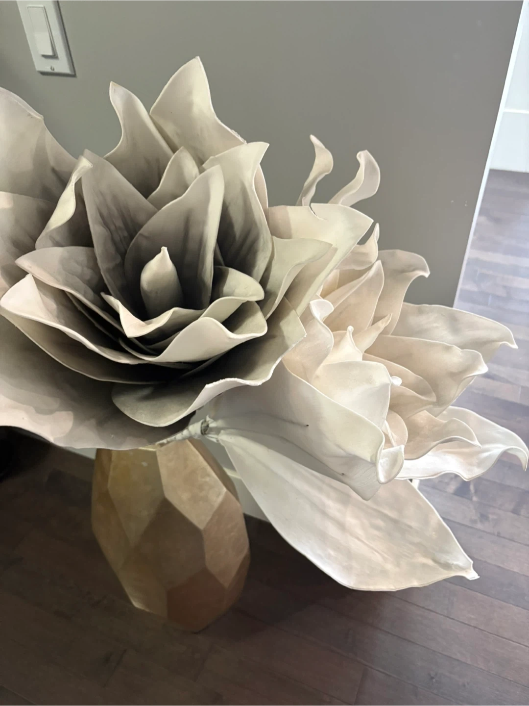 10Selling a large decorative flower arrangement. It's in great condition and would look lovely in any room. The flowers are a neutral colour, so they'll match any decor. Perfect for adding a touch of elegance to your home