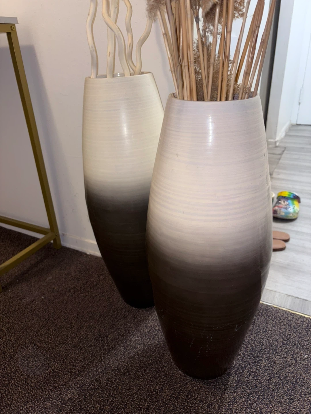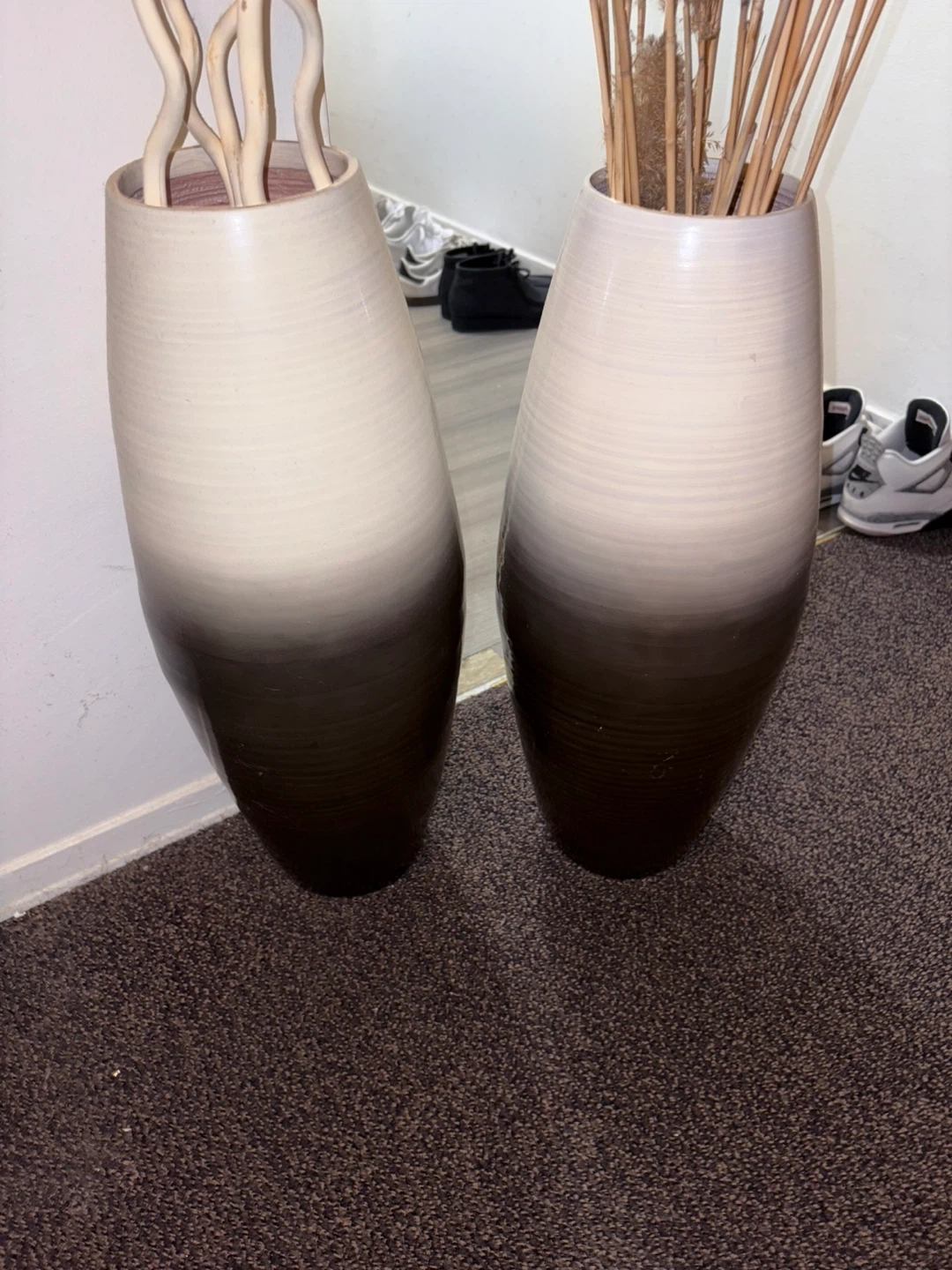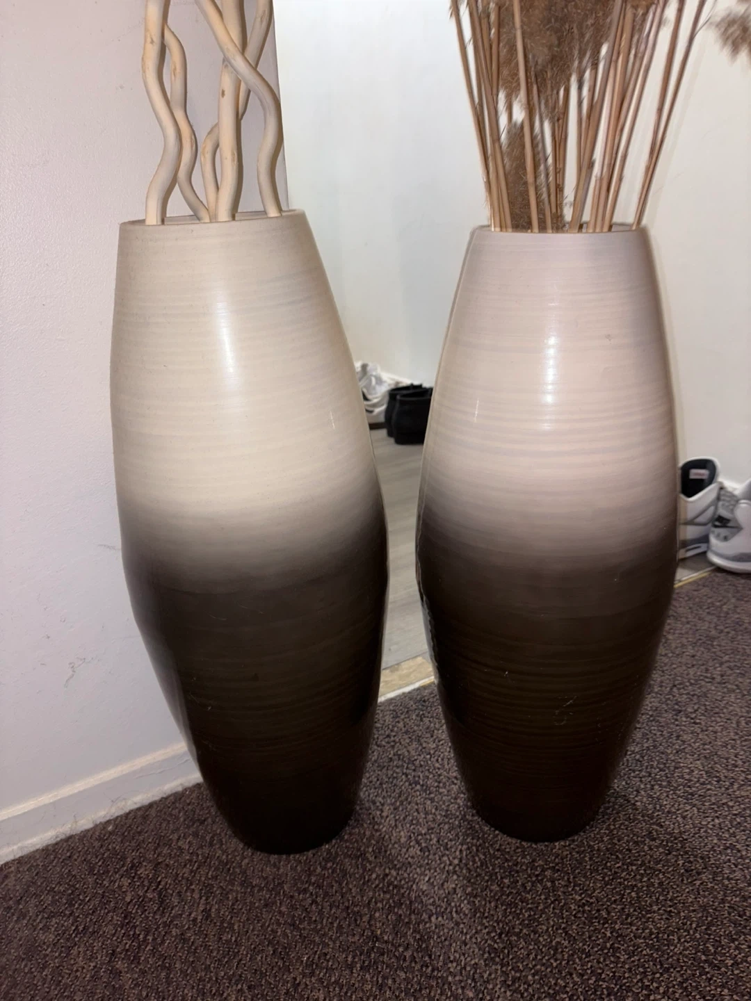 9Selling a set of two large decorative vases. They have a lovely ombre effect, fading from cream at the top to a dark brown at the bottom. Perfect for adding a touch of style to any room!