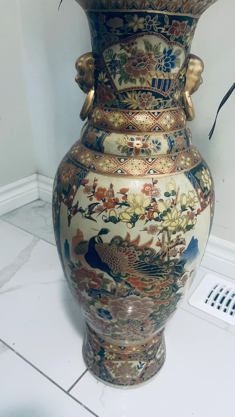 10This is a beautiful, large decorative vase. It features intricate floral and landscape designs with gold accents. It has lion head handles on the sides. It would make a lovely addition to any home!