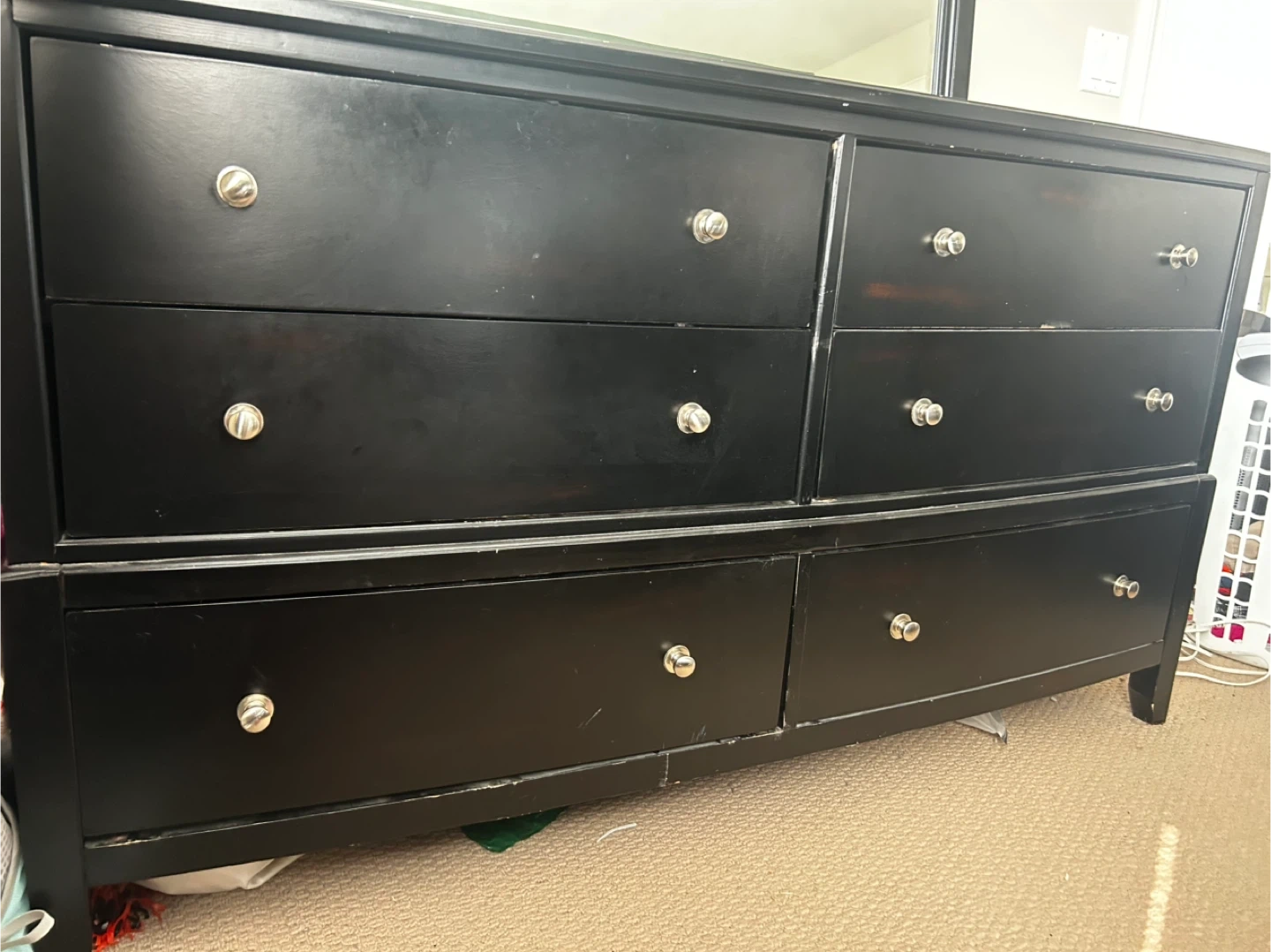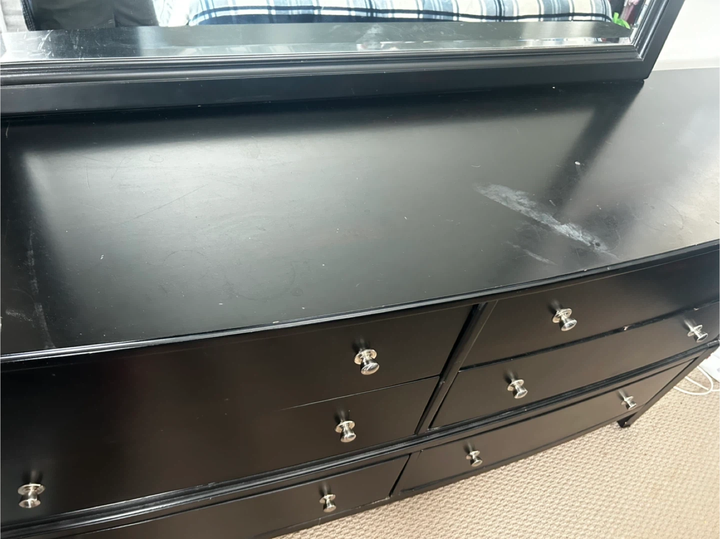 Good condition dresser & mirror in black/walnut colour. Minor knicks, imperfections and scrapes due to wear, moving & general life. Dresser: 2 drawers slide all the way out & can be fixed fairly easily. 67”W x 16.5”D x 37”H Mirror: attaches to dresser - only have 1 piece so would have to make a second. Also can be hung or used separately. 48x38” Pickup in Albion 240&102 area.