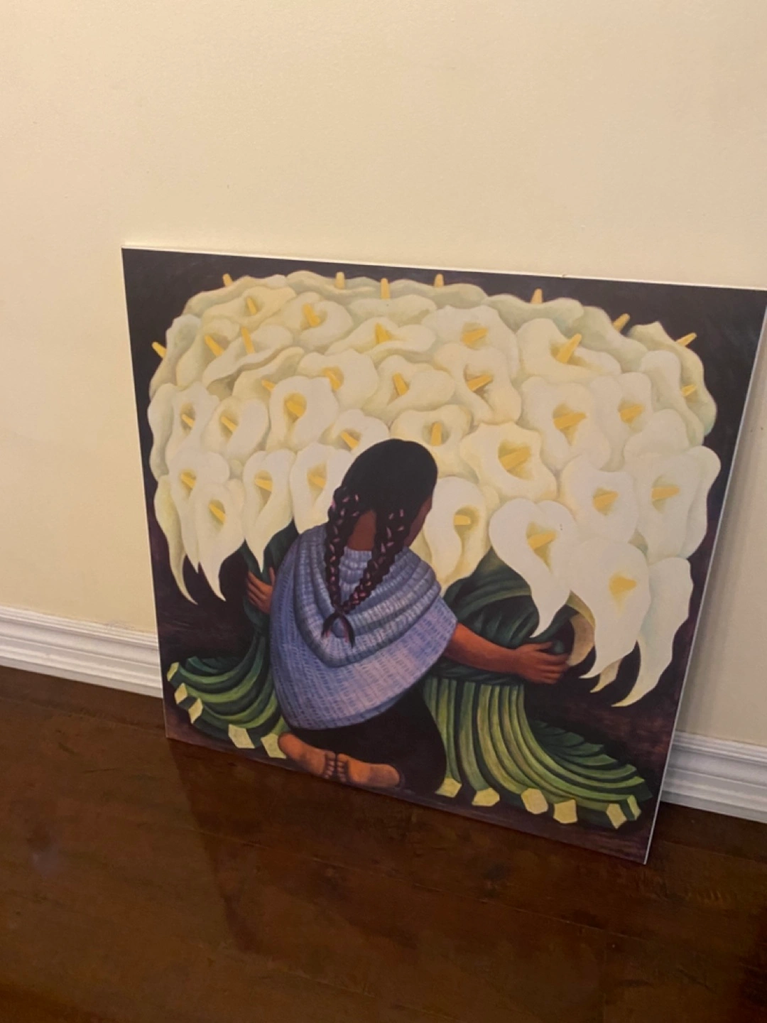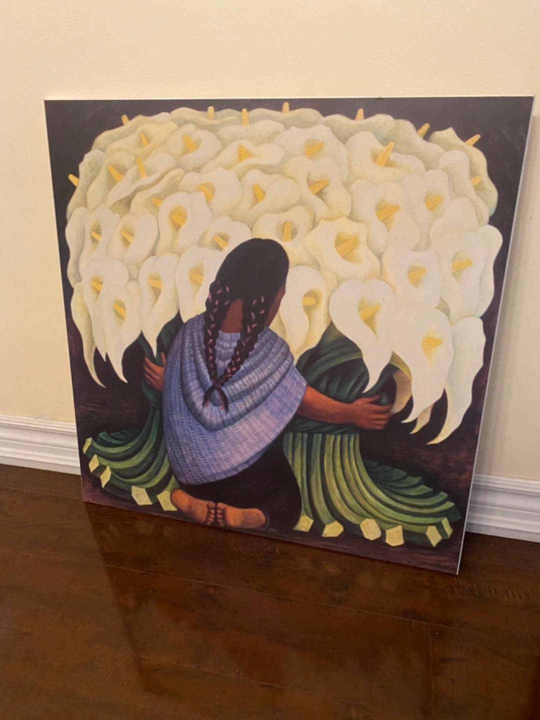 Beautiful artwork depicting a young girl with a large bouquet of white flowers. Vibrant colours and unique style. Canvas print, large size. Great for home décor.