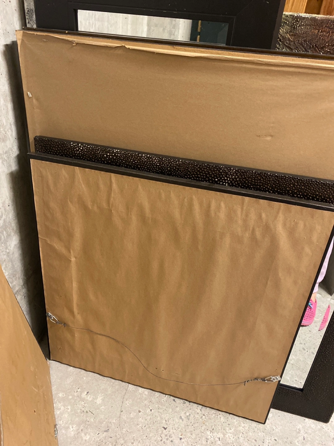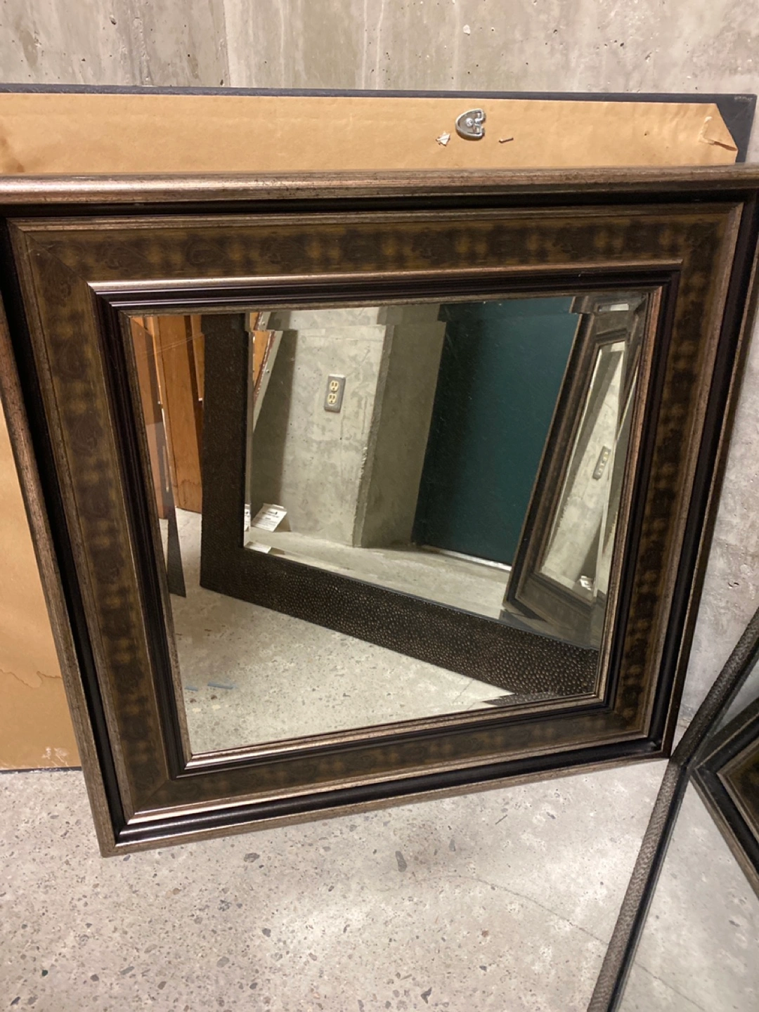114Large square mirror with a dark brown frame. It has a textured finish. Frame 28”x 28” Mirror 19”x 19”