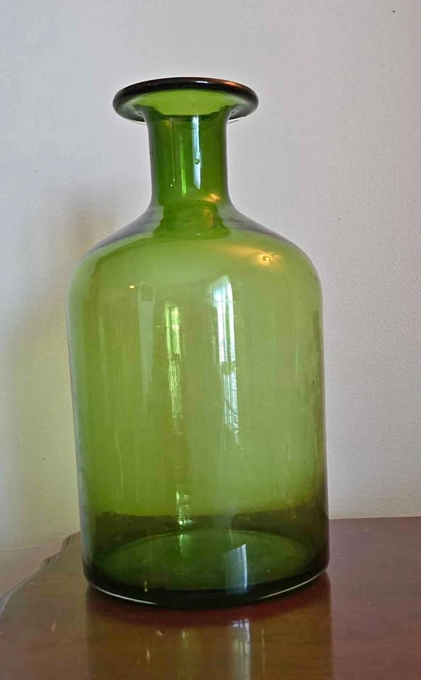 Decorative green glass vase in perfect condition. Large 13.5" high x 6.5" diameter across.