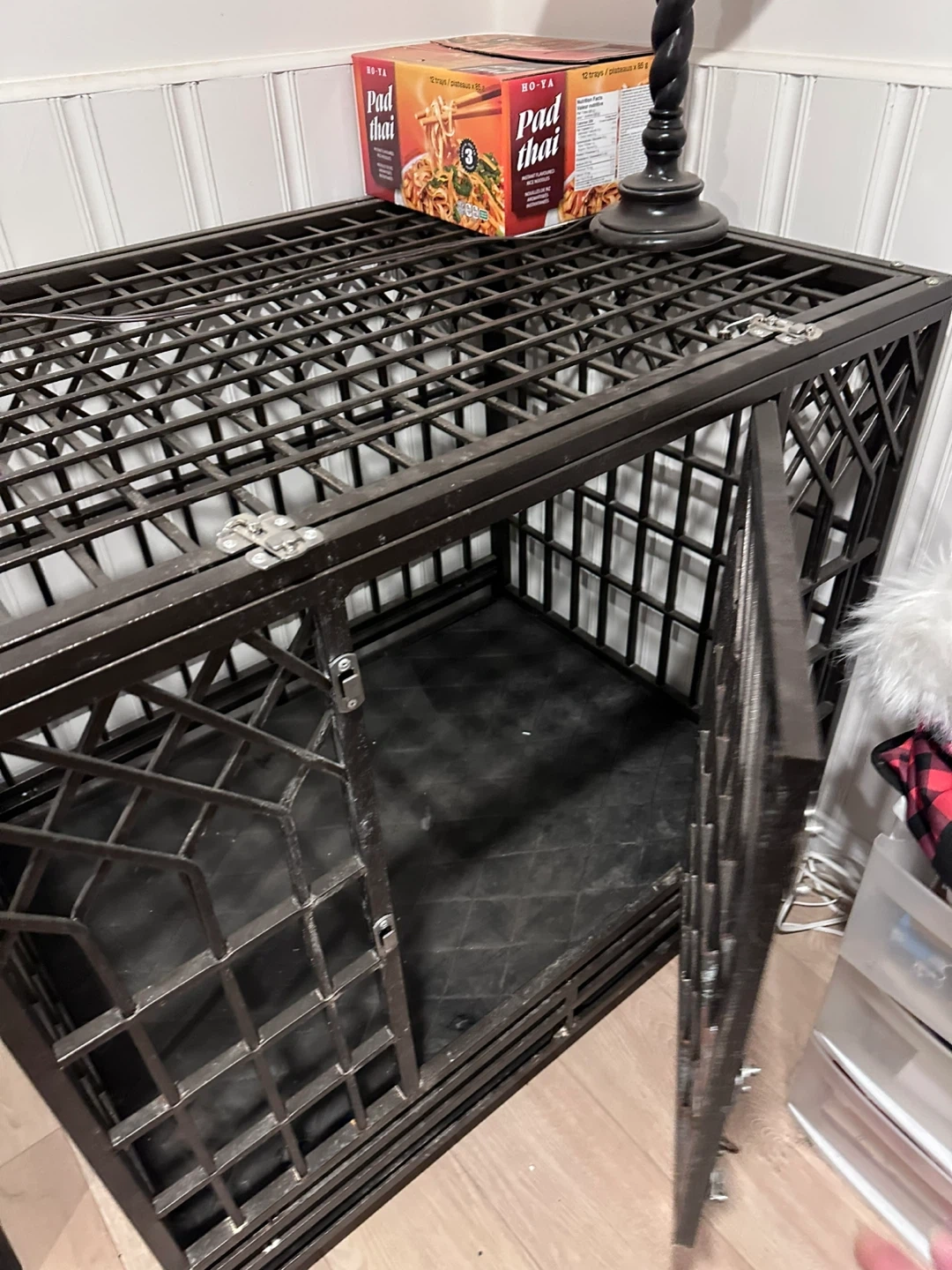 Selling a large metal dog crate in black. It's in good condition and ready for a new home. Perfect for providing a safe and secure space for your furry friend! Crate liner/ tray included
