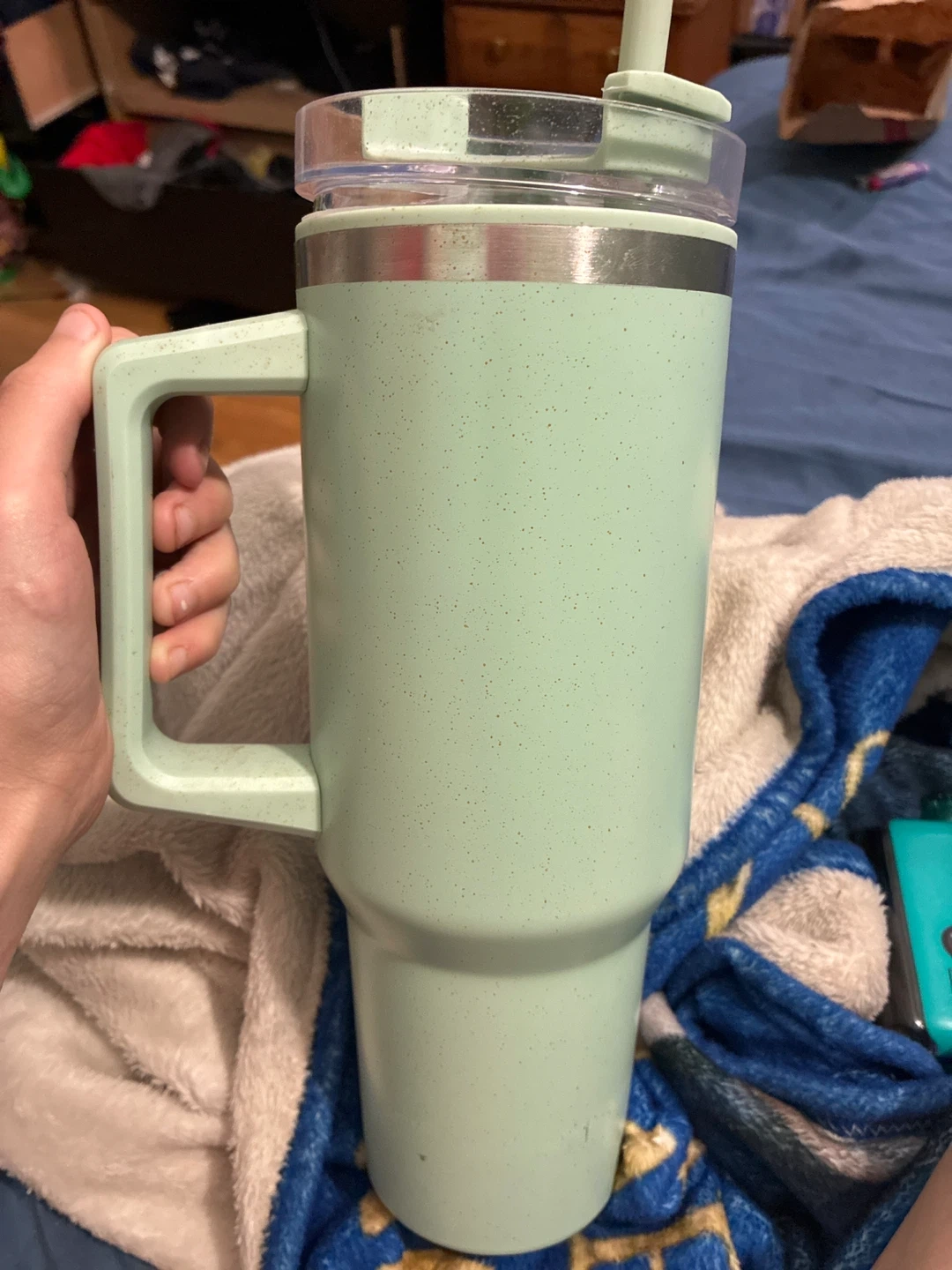 Here's a large insulated tumbler in a pretty mint green colour! It comes with a handle and a straw, perfect for keeping your drinks cold (or hot) on the go. It's in great condition and ready for a new home
