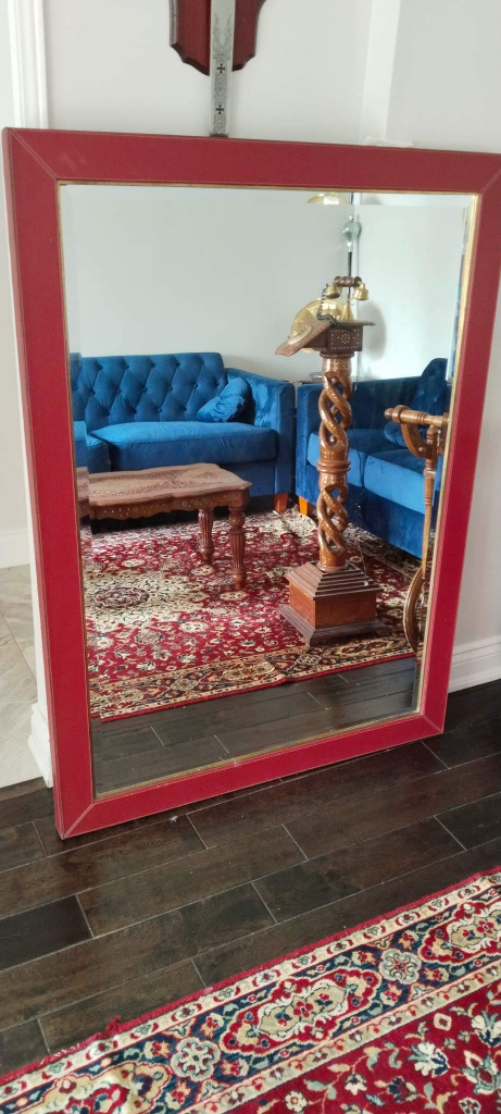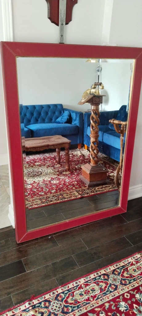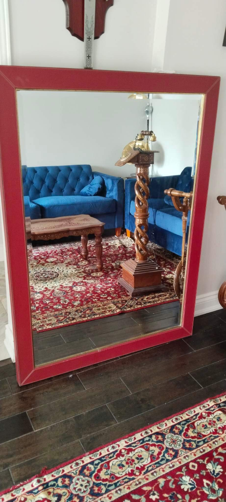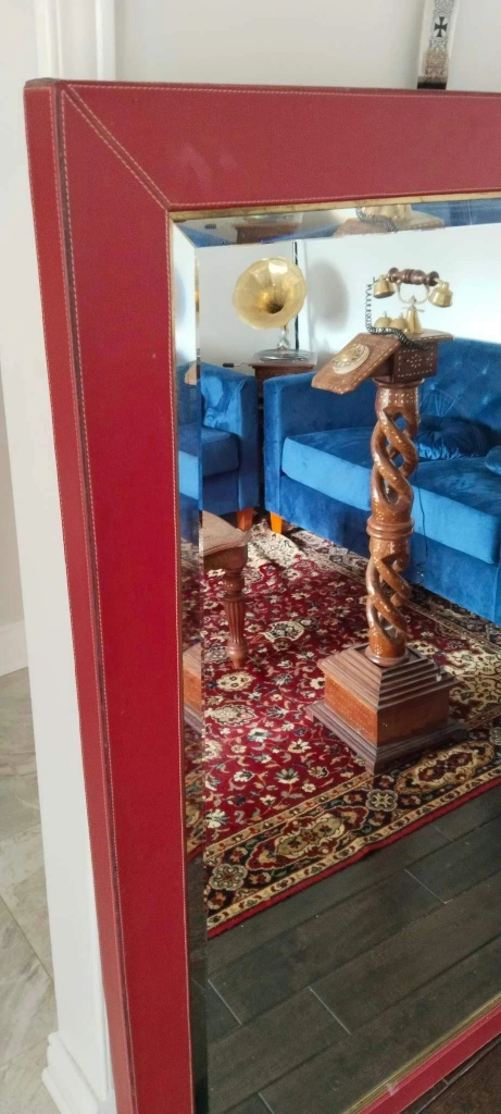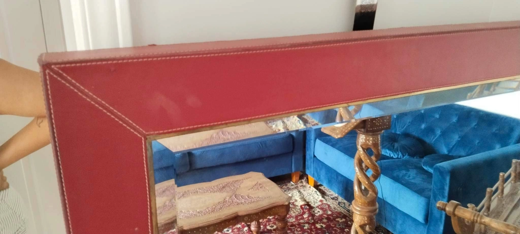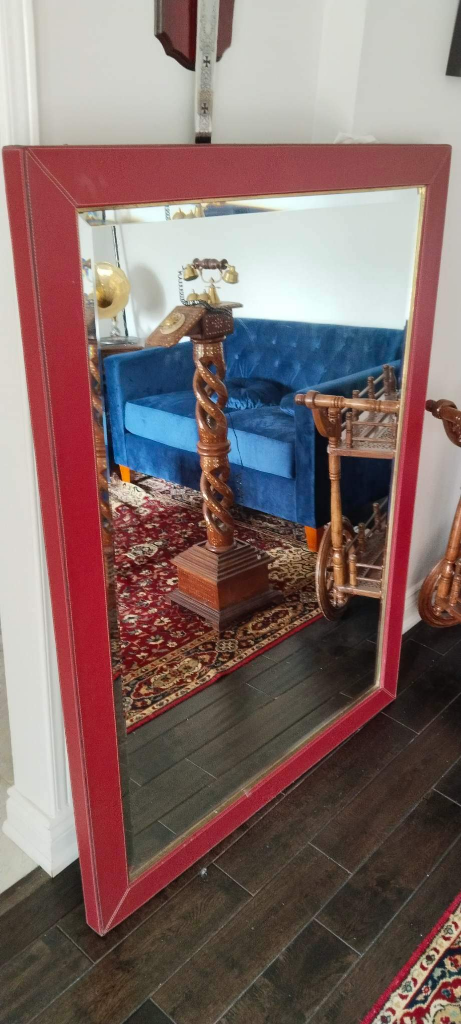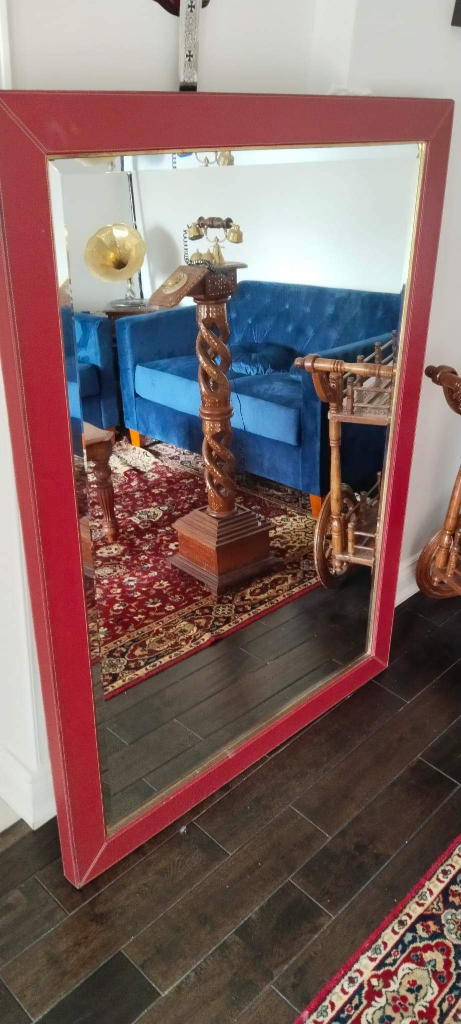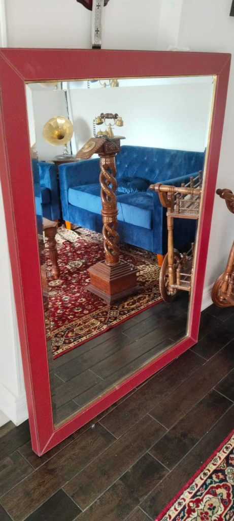 Large mirror bound in red leather frame with white stiches Dimensions-43w x 58Lx 2w