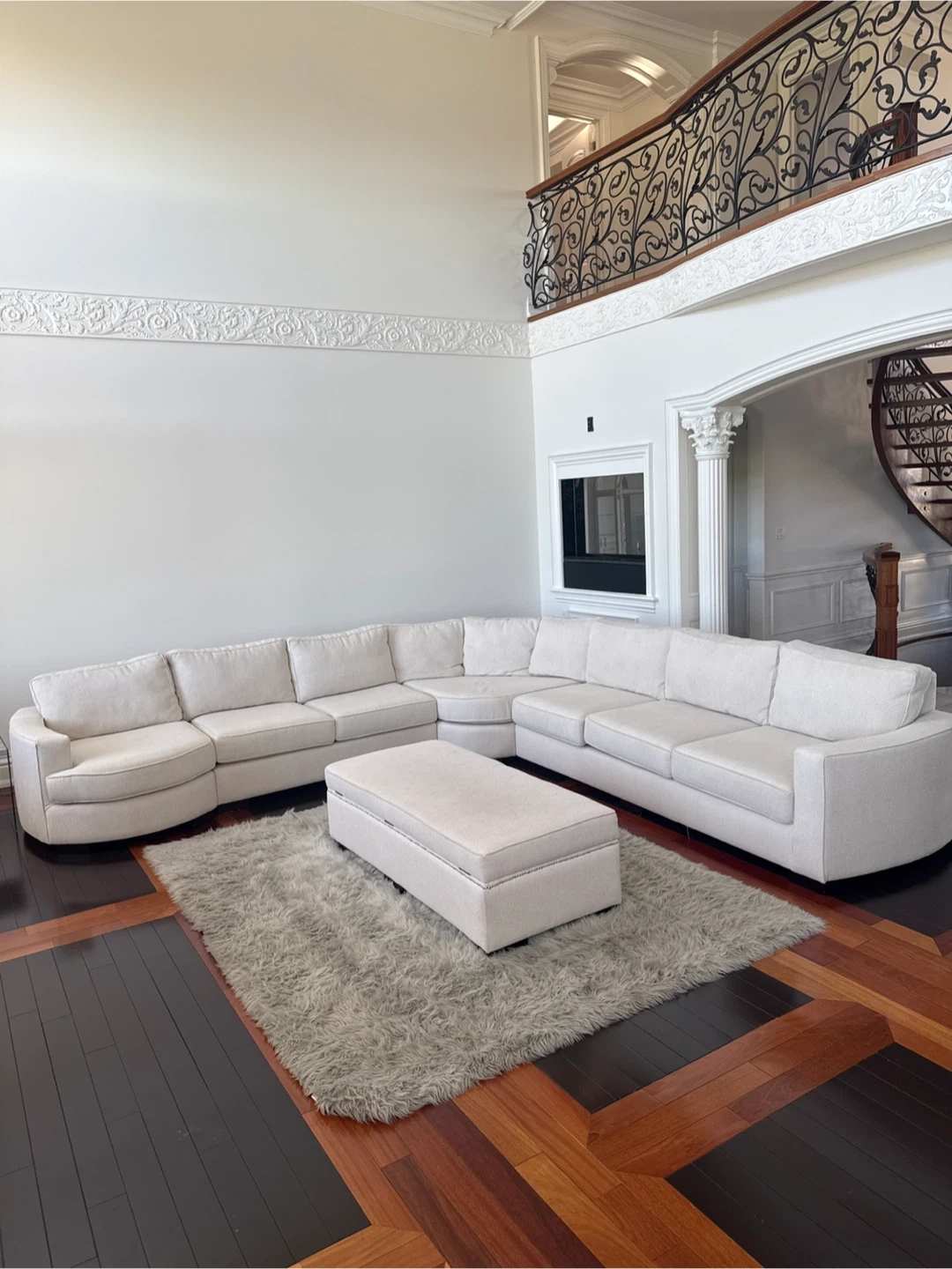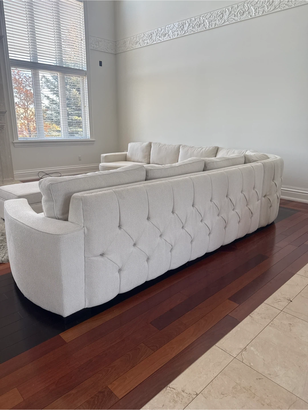 60Selling a large, off-white sectional sofa. It's in great condition and would be perfect for a large living room or family room. The sofa features a button-tufted back and a comfortable, neutral colour that would suit any decor. It's a great piece for lounging and entertaining!