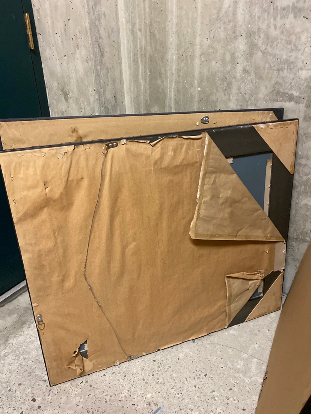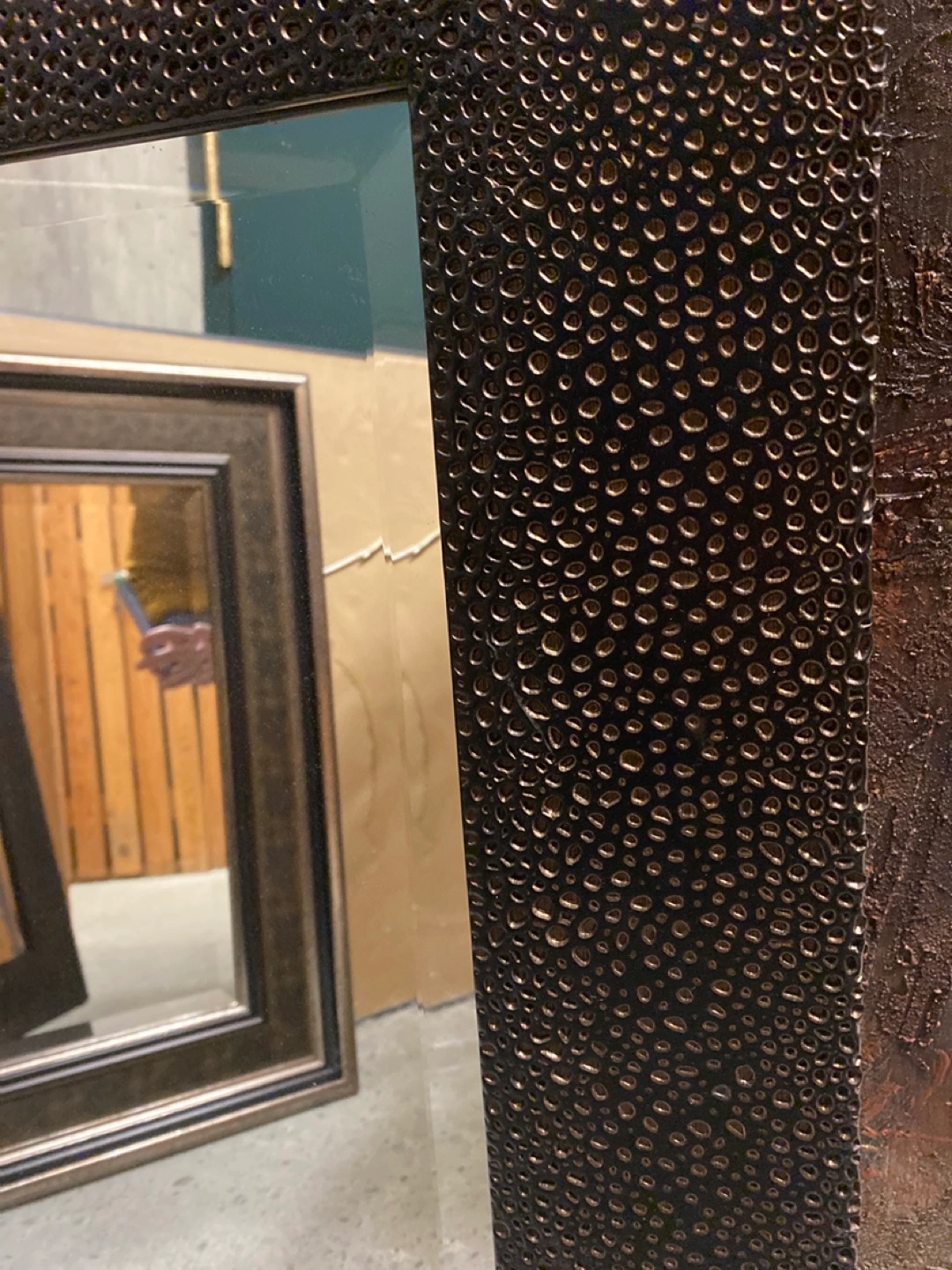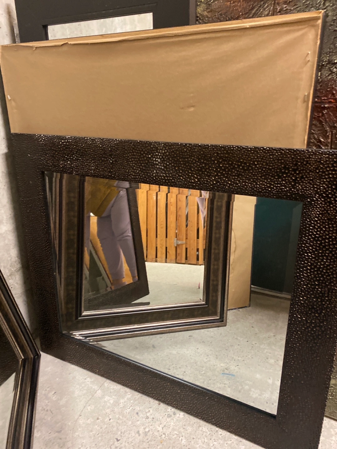 114Large mirror with an ornate frame. The frame has a textured finish. Frame 36,5” x 31” Mirror 28” x 22”