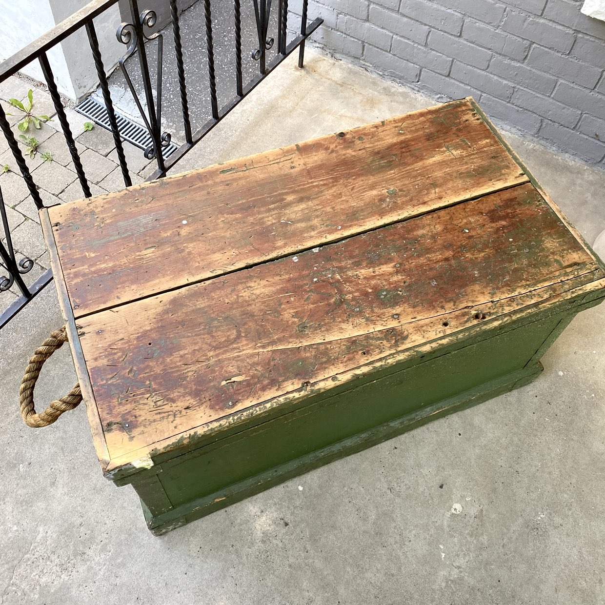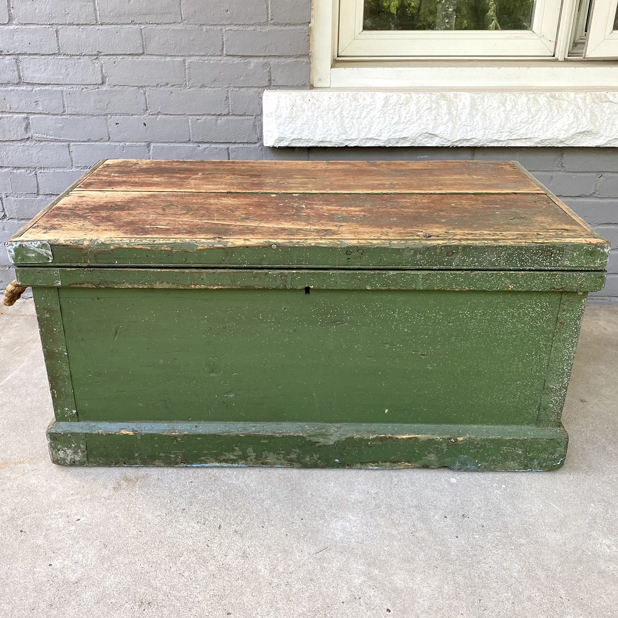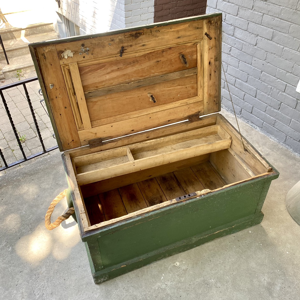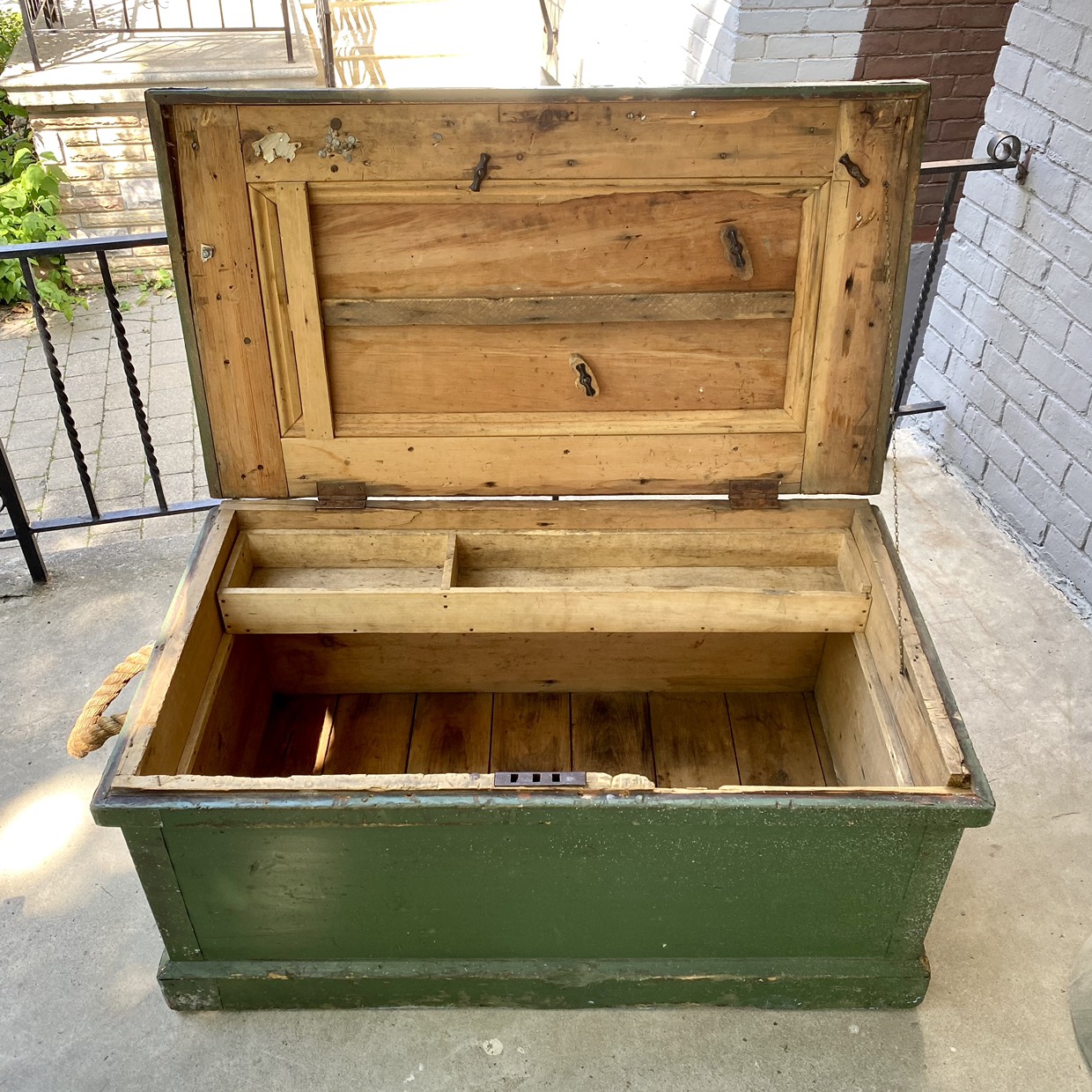 Large, primitive green wooden chest or box with hinged lid, thick rope handle and removable interior tray. Would make a great coffee table. Top is made of two 11” wide boards. Great patina! 40x23x19”