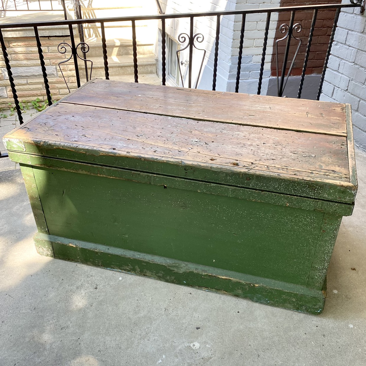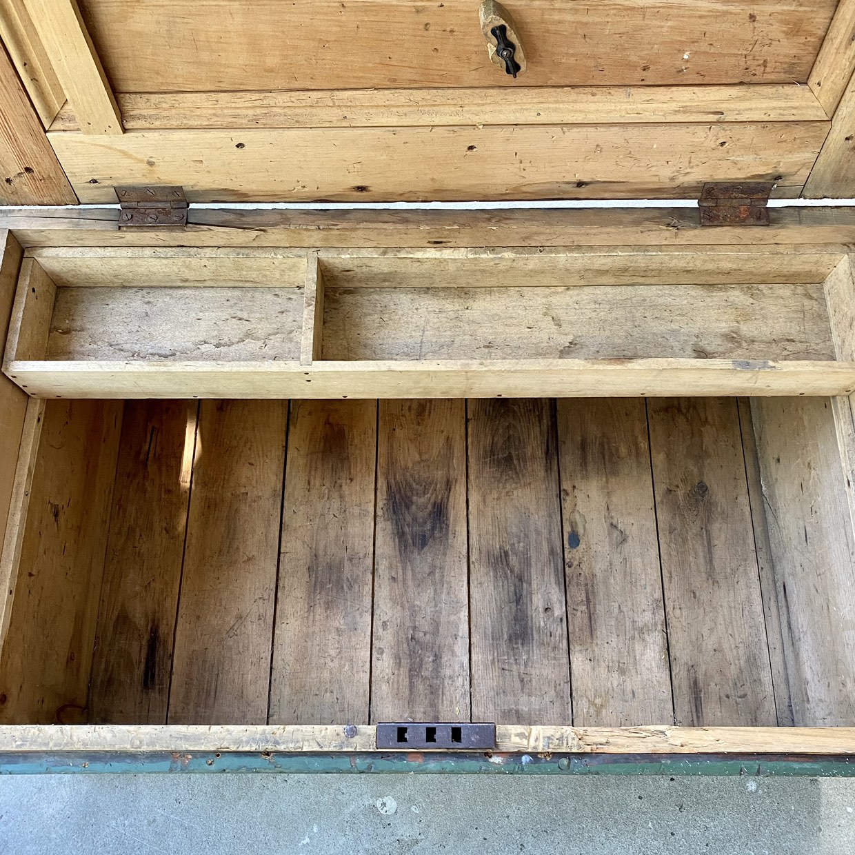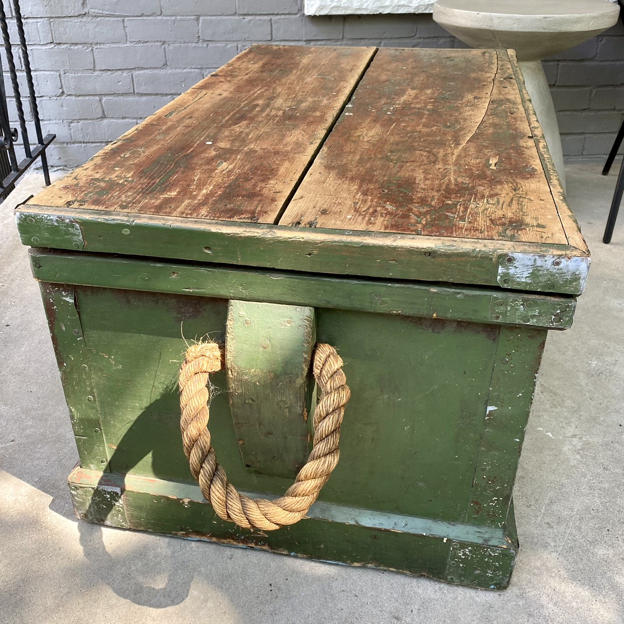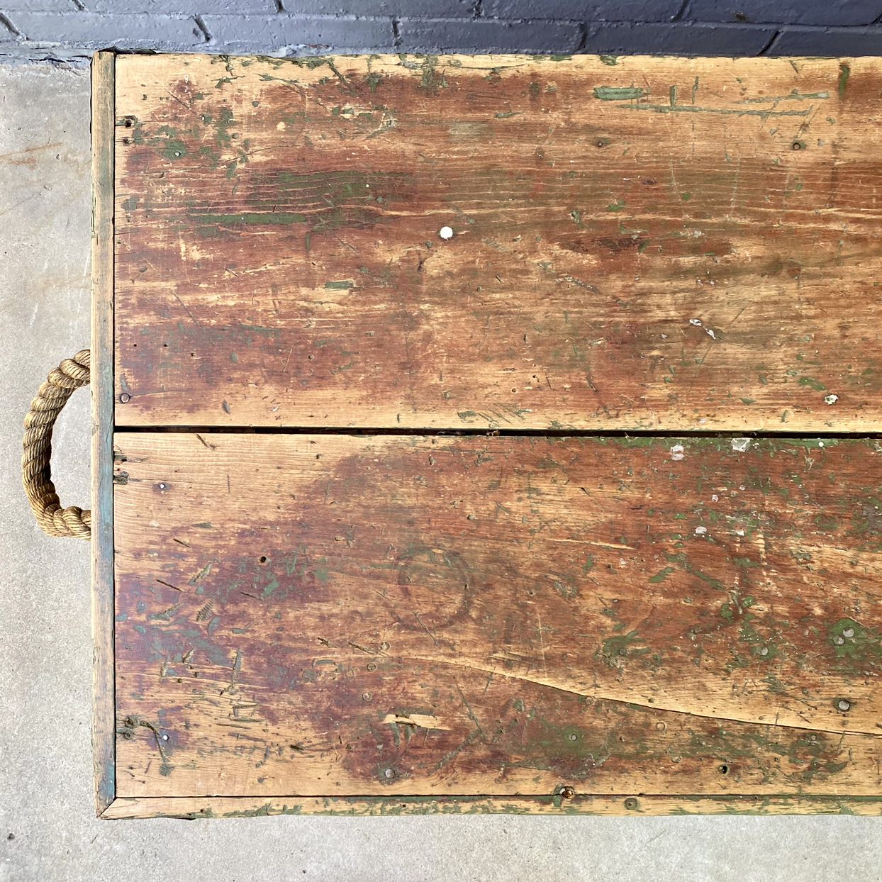 Large, primitive green wooden chest or box with hinged lid, thick rope handle and removable interior tray. Would make a great coffee table. Top is made of two 11” wide boards. Great patina! 40x23x19”