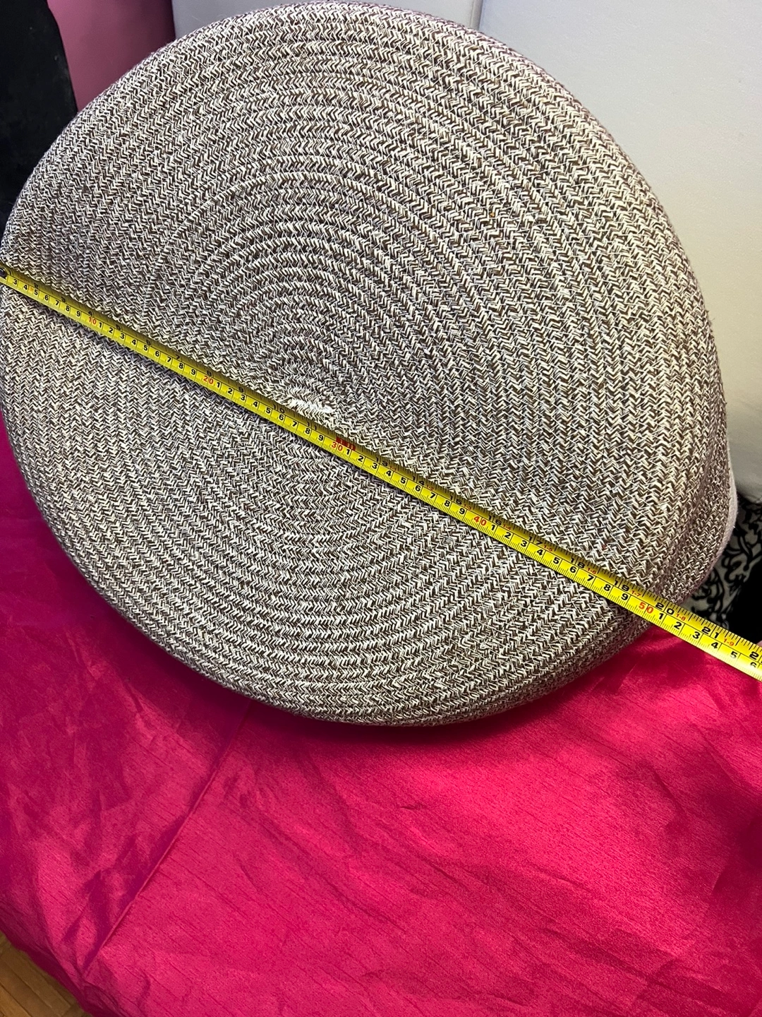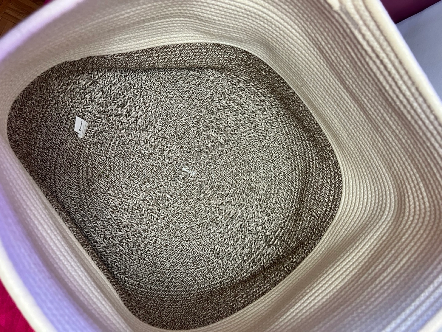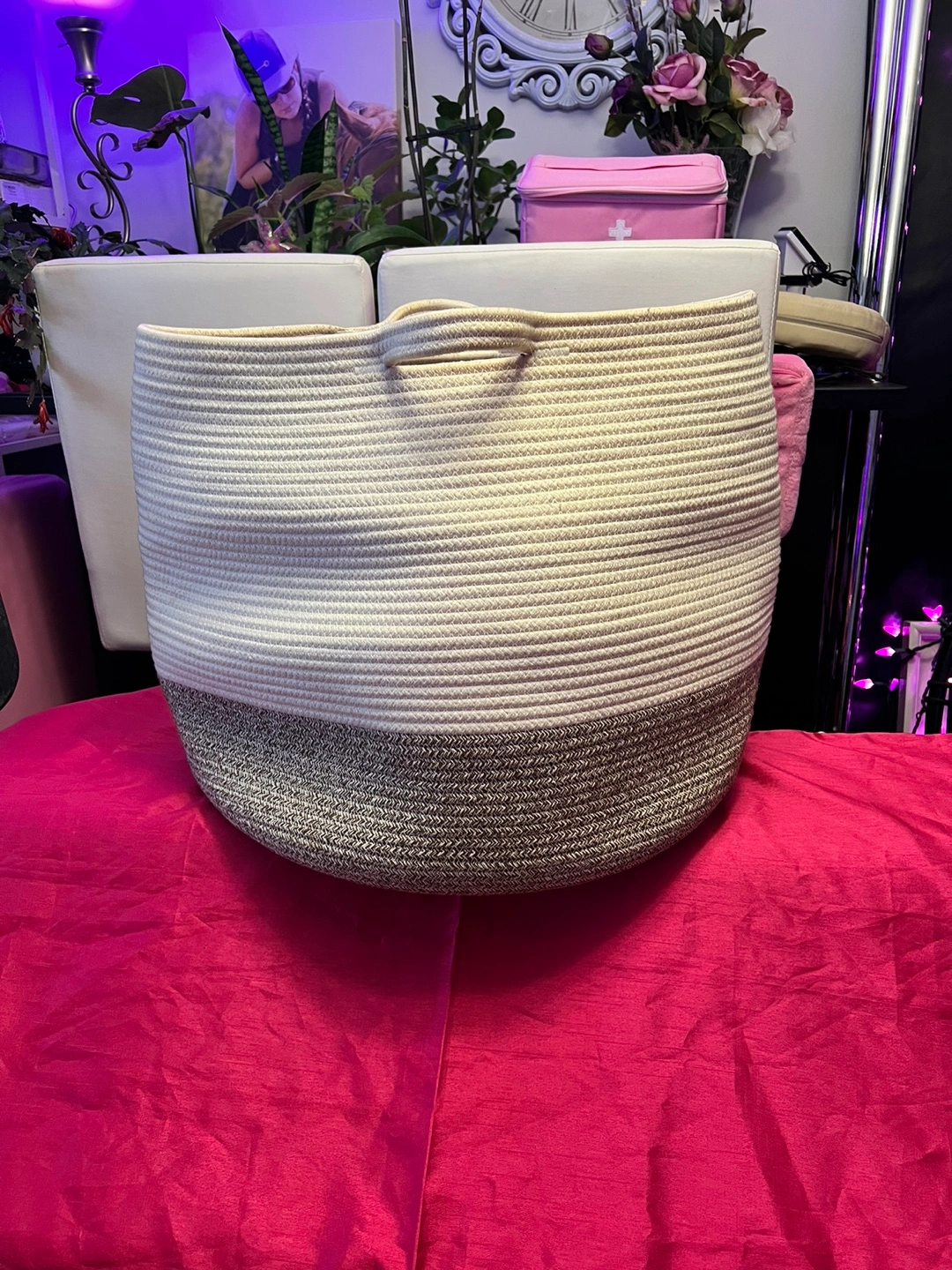 52Spacious storage basket. Cream and grey colour scheme. Rope construction. Perfect for blankets, toys, or other items. Measures approximately 19.5 inches in diameter.