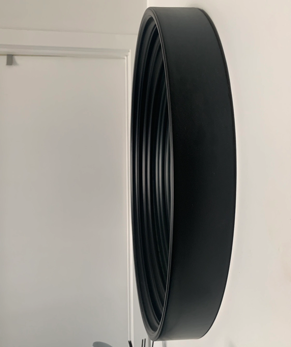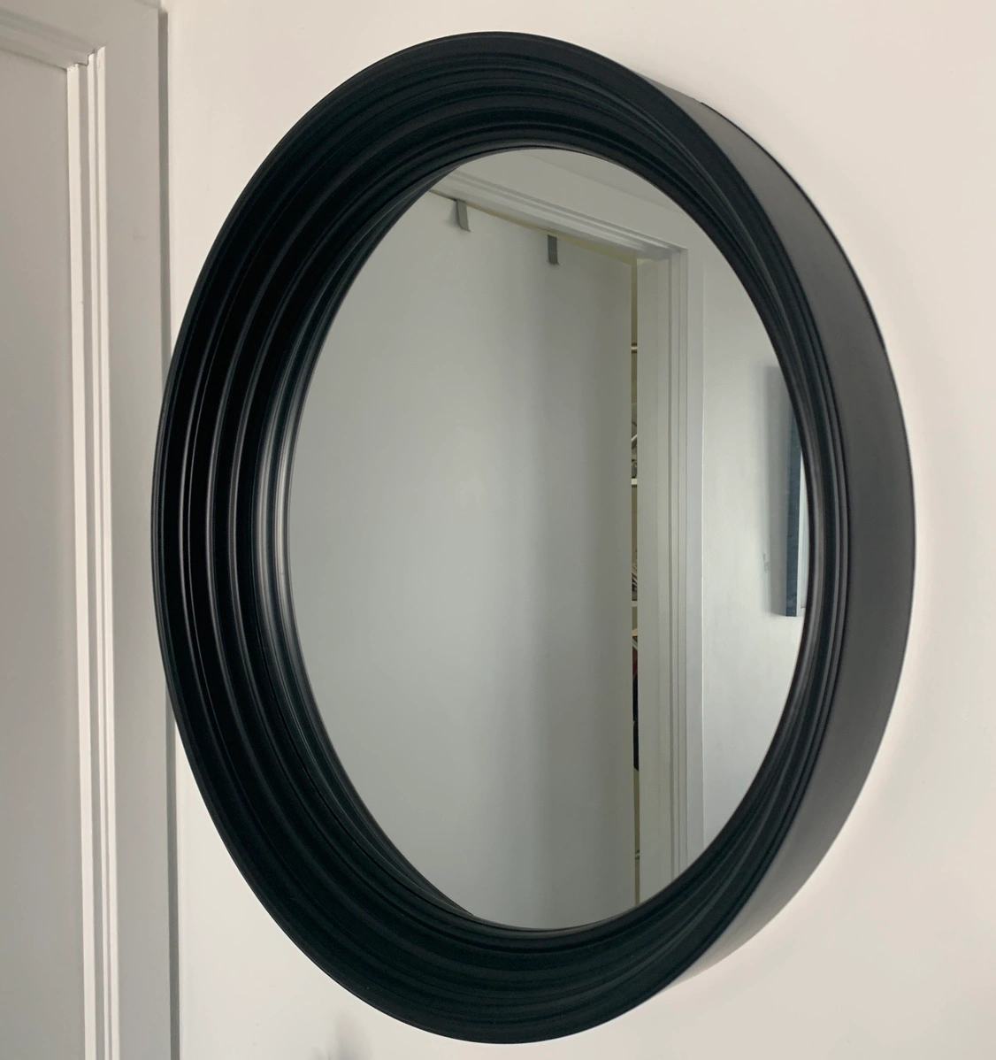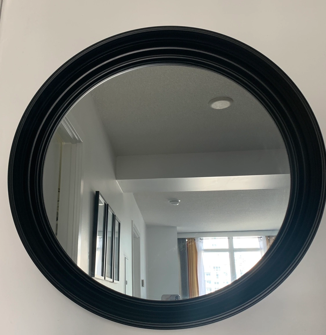120A large round 24” mirror with a thick black 3” frame. It would look great in a living room, bedroom, bathroom, or vanity. Cash and pickup only.