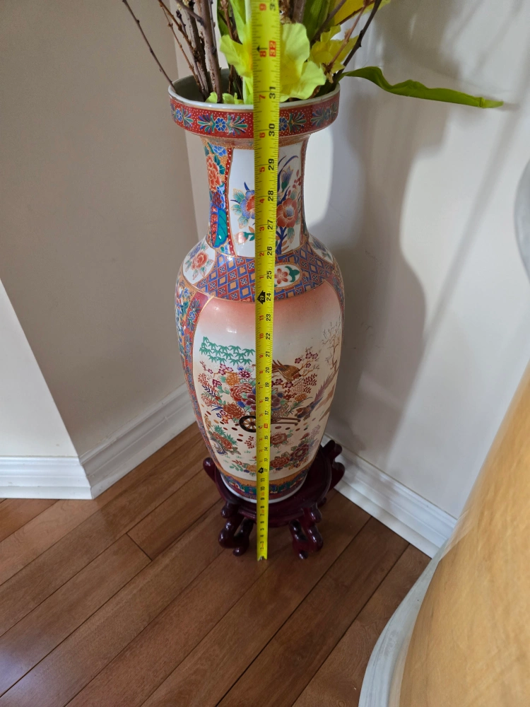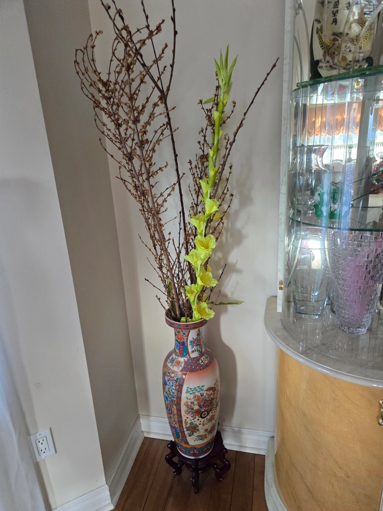 Tall decorative vase. Features an ornate design. Includes a wooden stand. Excellent for displaying dried or artificial flowers.