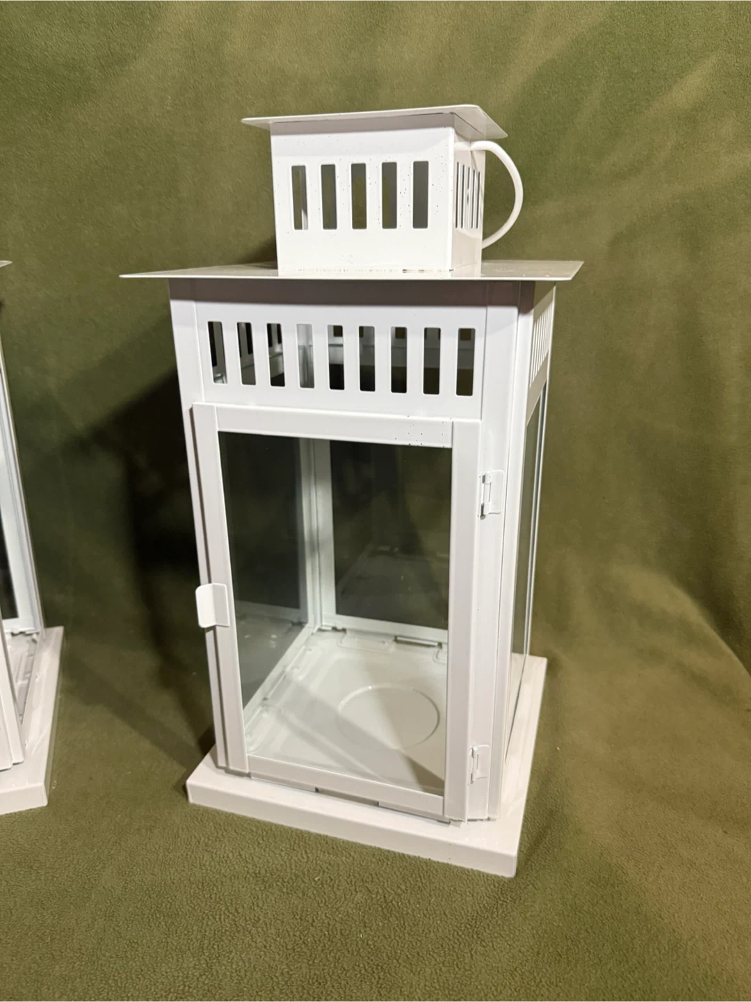 Enhance your home decor with these elegant, large white candle lanterns, perfect for creating a cozy ambiance. These lanterns have a sturdy metal frame with glass panels, offering a safe and stylish way to display candles. The lanterns are in used, but good condition and ready to brighten up your space. * **Style**: Classic lantern design * **Colour**: White * **Material**: Metal and Glass * **Size**: Large Asking $85 for the pair If this ad is still up, then yes, it's still available!