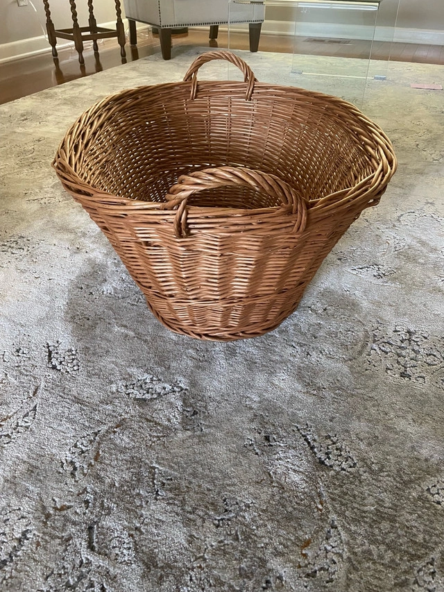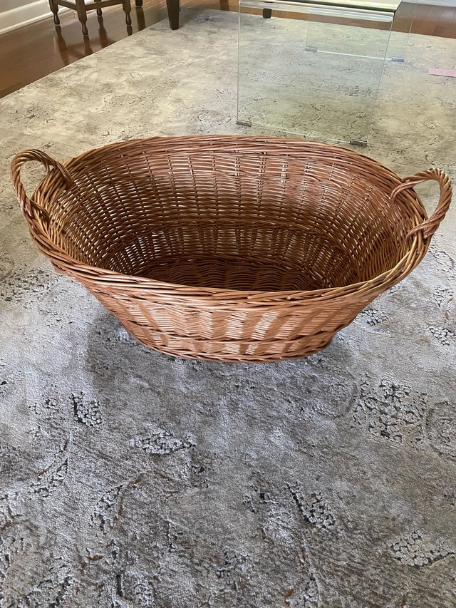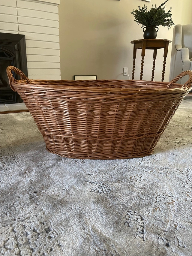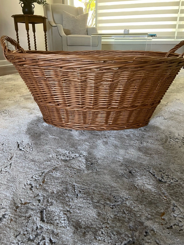 This is a large, brown wicker basket, perfect for storage or decor. The basket is used but in good condition, ready to add a rustic touch to your home. It features sturdy handles for easy carrying and a spacious interior. It would look great as a blanket basket in a bedroom or a toy basket in a playroom! If you're seeing this ad, the basket is still available!