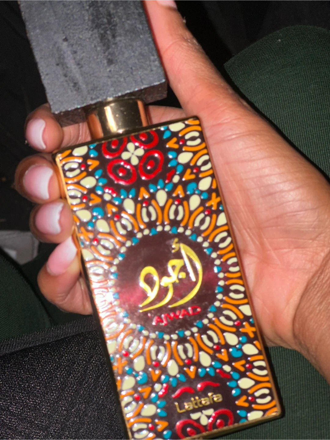 Selling a bottle of Lattafa Al Aoud Eau de Parfum. It's a natural spray for external use only, with a volume of 88%. The bottle has a beautiful, colourful design.