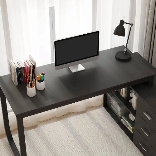 Corrigan Studio® Latwon L-Shape Desk. Spacious and modern wood/metal desk with a flexible, L-shaped design. Great for home or private offices. ⚠️ Note: Hardware is missing — buyer will need to supply parts to complete assembly. Available in black only. Size: 55"L x 41"W x 30"H 3-tier drawer storage (drawer side is fixed after install) Wood surface + thickened metal tube frame Desk & cabinet can be rearranged for your layout Office chair not included. Contact: Message here or call/text 289‑788‑8085.