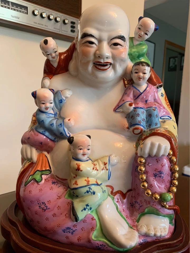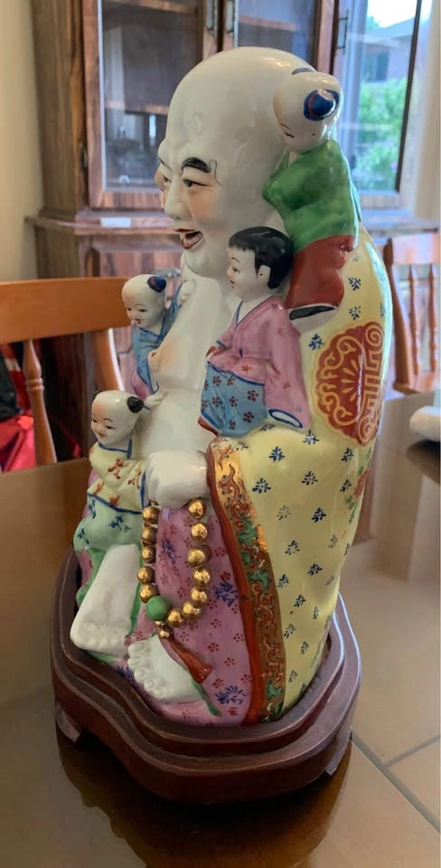 Porcelain laughing Buddha with 5 Children figurine. It represents fertility, harmony, and the wish for many children and grandchildren. The five children clinging to or playing with the Buddha are often interpreted as representing the five elements (earth, fire, water, wood, and metal) and their balance in the home. The statue is also seen as a symbol of happiness, joy, and the banishment of negative energies. Comes with stand. Approximate measurements 12"Hx9"W.(with stand 13.5"H). PU: Kennedy & Finch in Scarborough or can arrange pickup in Mississauga- Colonial Dr & Burnhamthorpe Rd WP