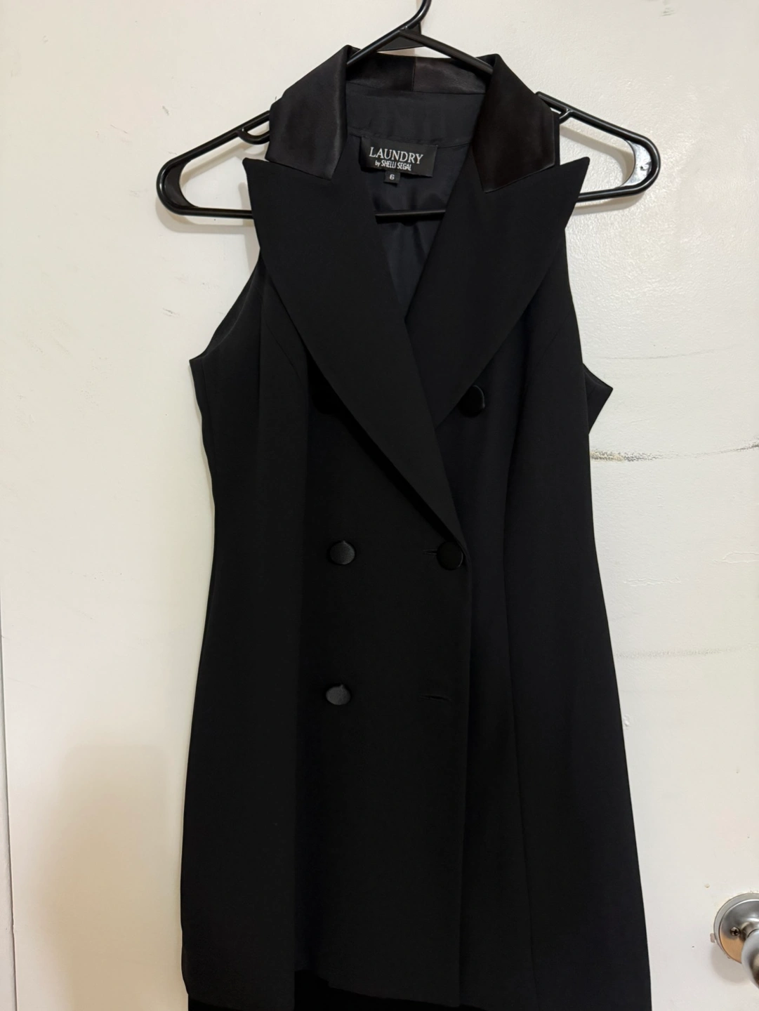 758Black blazer dress. Double-breasted. Size 6. Features a notched collar with a satin-like material. Sleeveless. Used once
