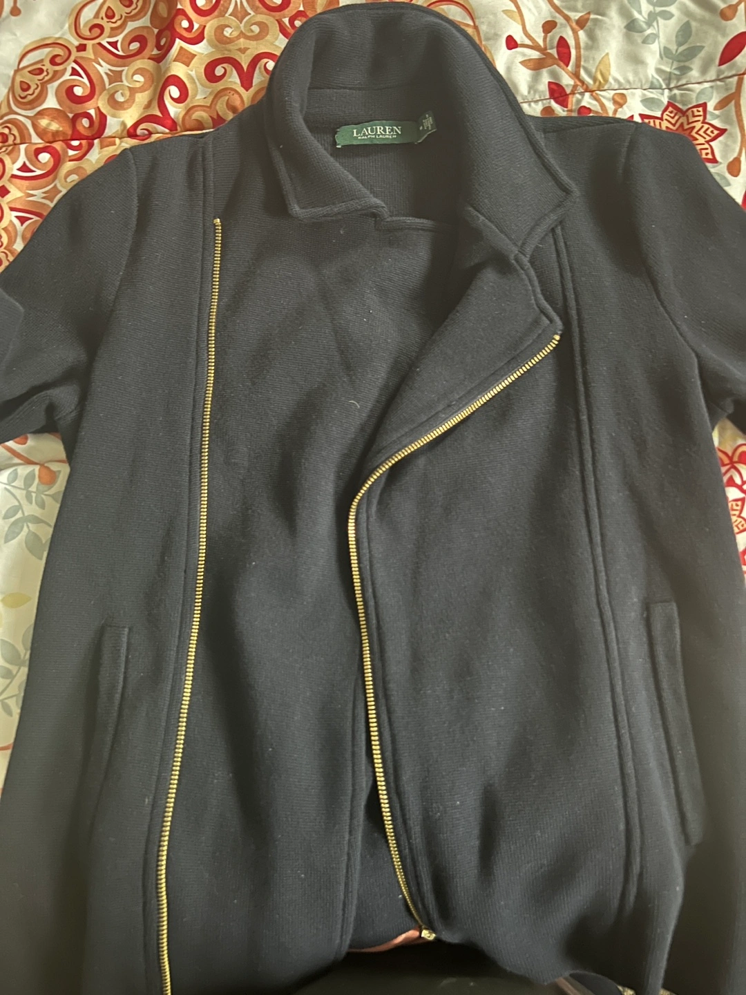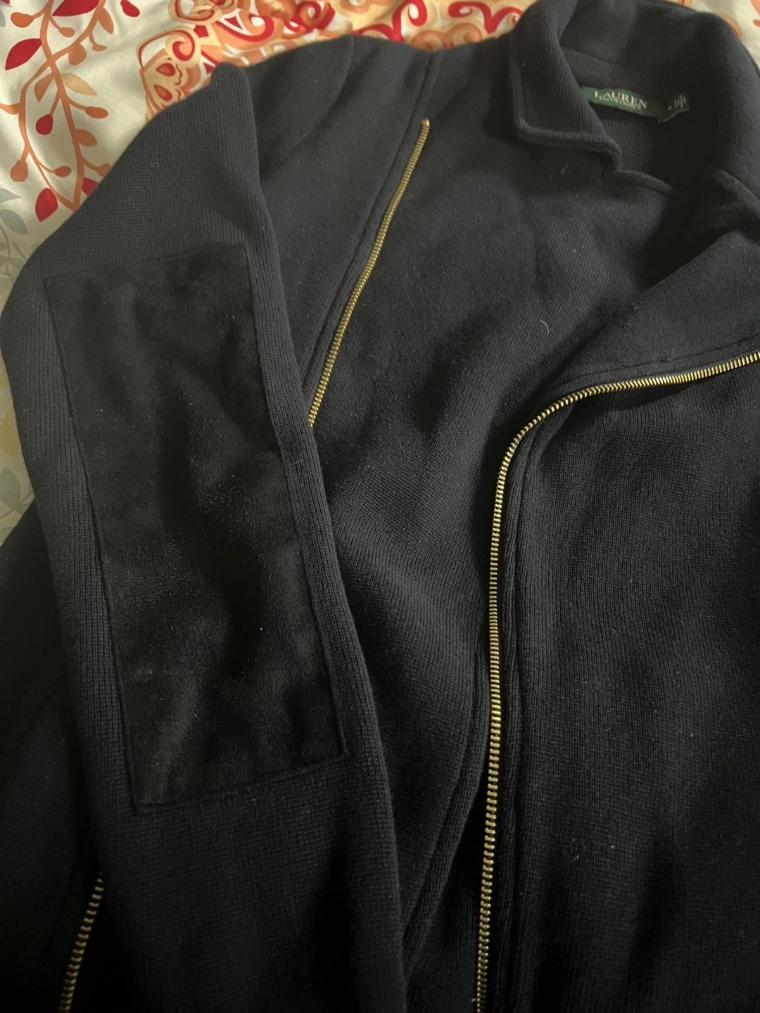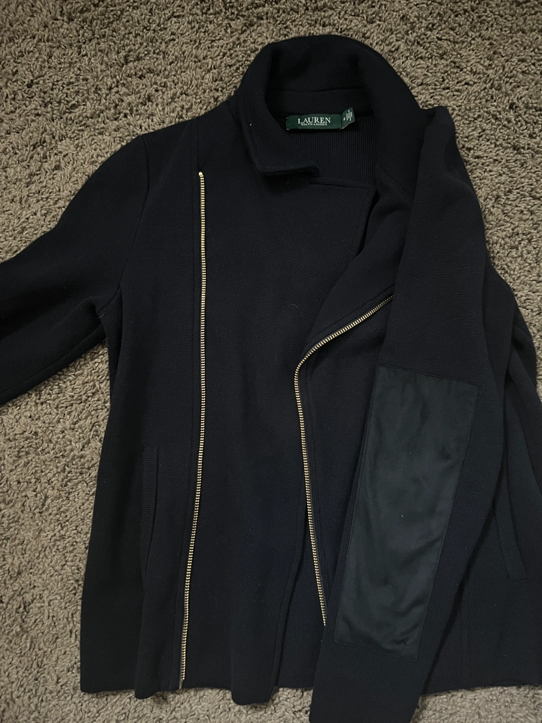 Women's size medium Lauren Ralph Lauren black knit jacket. Asymmetrical zipper closure. Gold-tone hardware. Features elbow patches. Long sleeves. Good condition.
