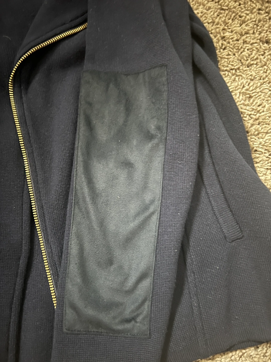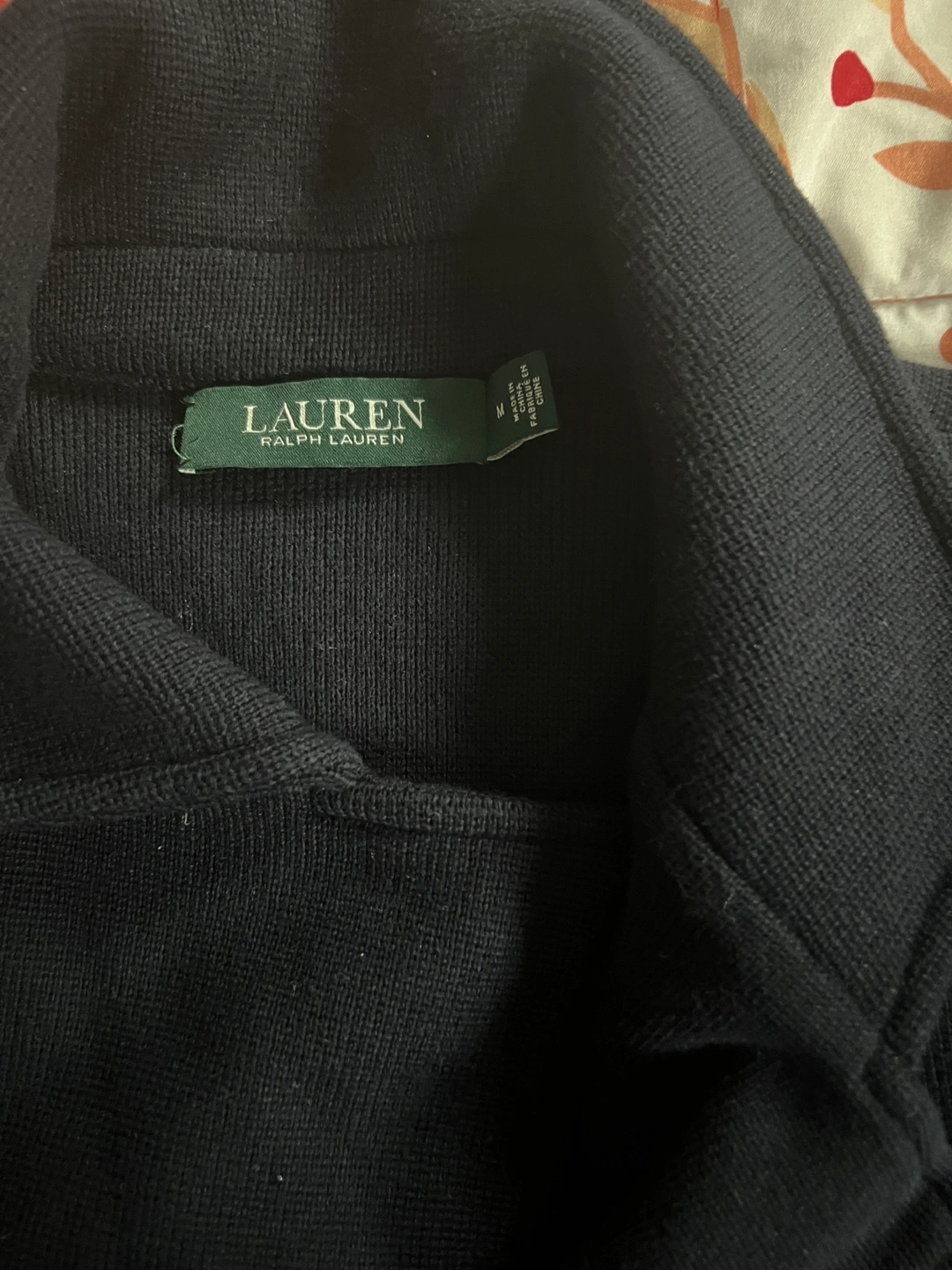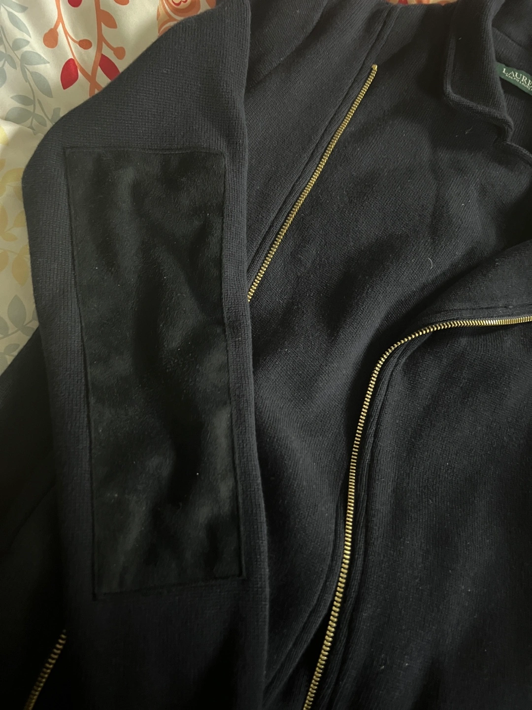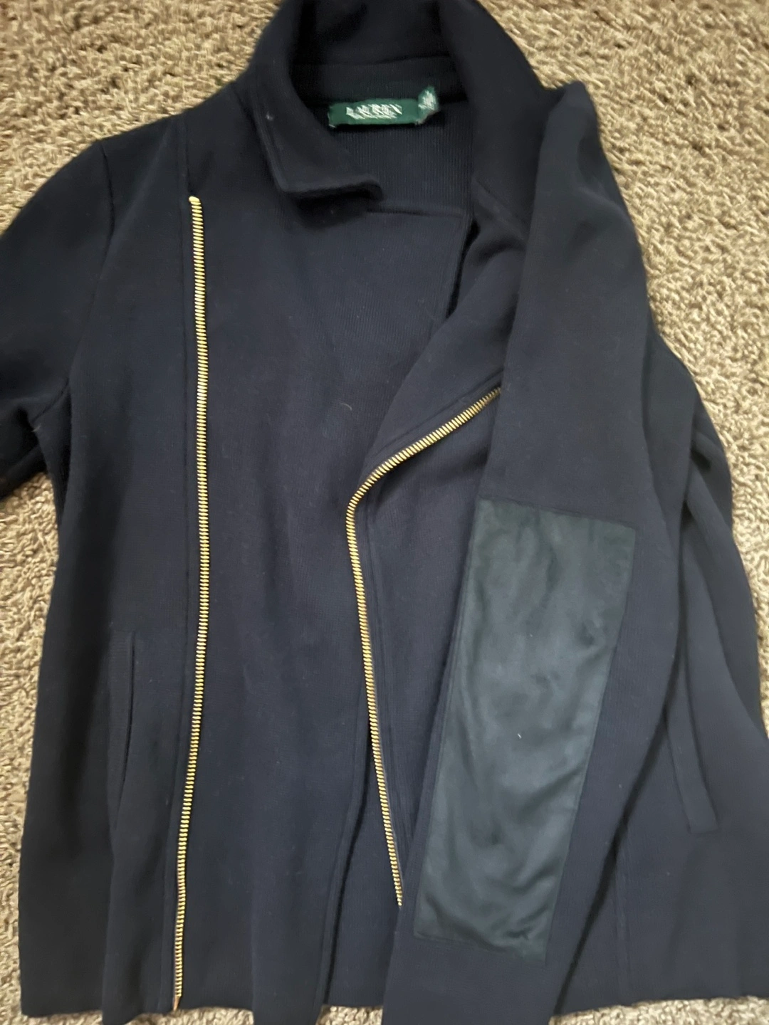 Women's size medium Lauren Ralph Lauren black knit jacket. Asymmetrical zipper closure. Gold-tone hardware. Features elbow patches. Long sleeves. Good condition.