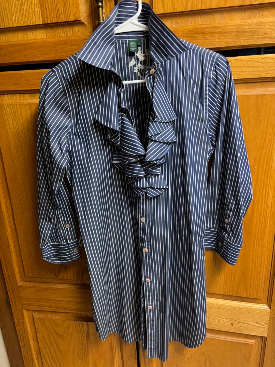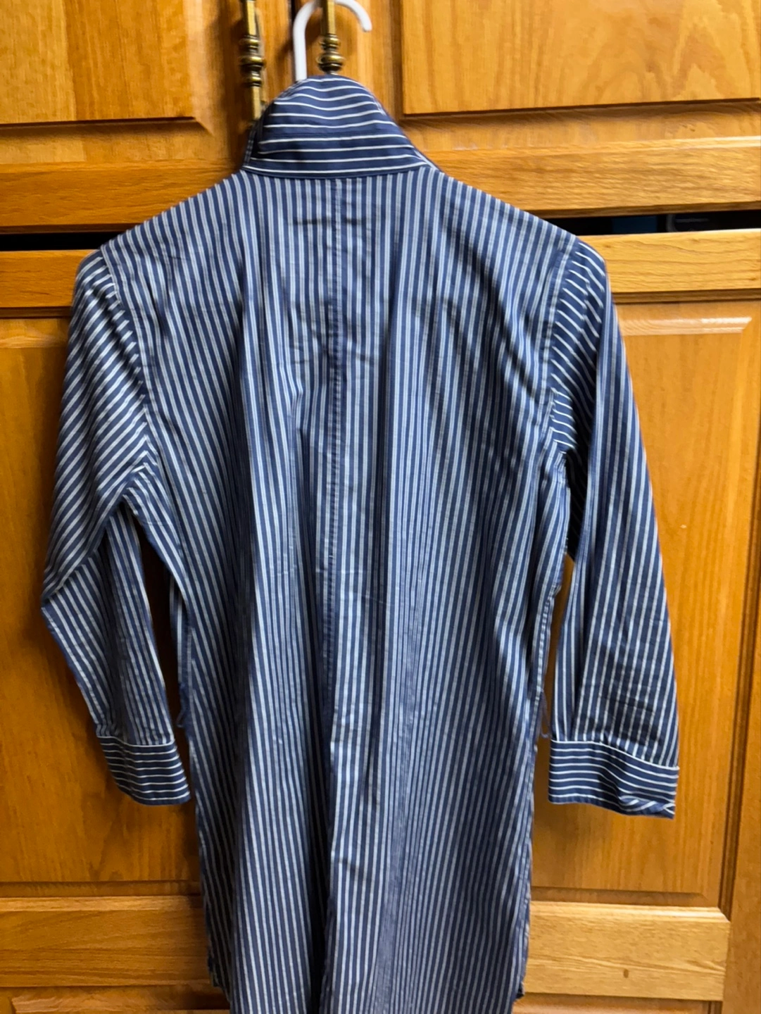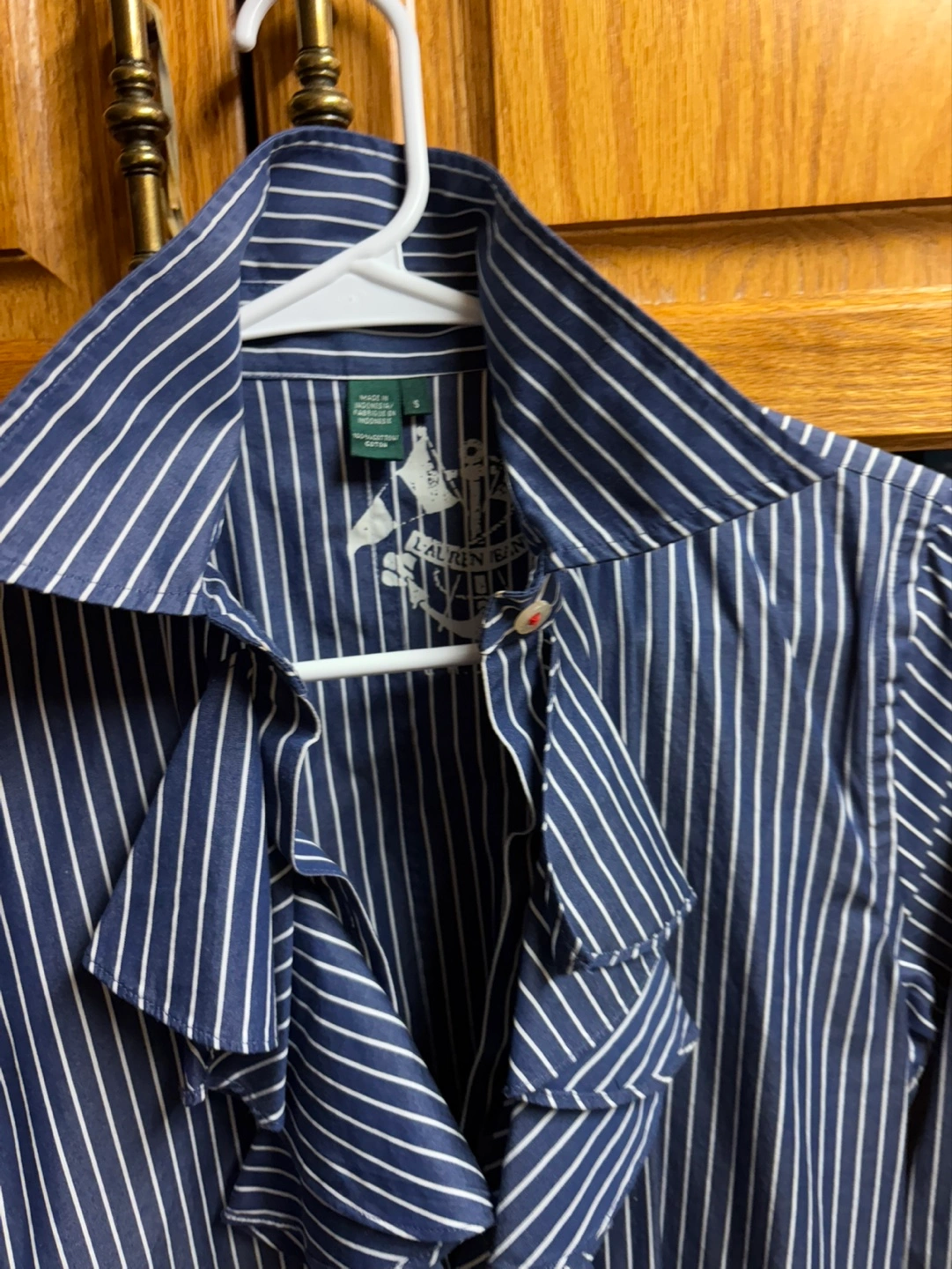 Beautiful navy and white striped shirt dress. Features a ruffled neckline and full length sleeves. Button closure. Size small This can be worn as a shirt dress comes just above knees or worn as a tunic …. Or can be worn over a tee as a coat for summer months …. Use your imagination with this designer shirt by Ralph Lauren …. Beautiful cotton ! Not to many things made with 💯 cotton ! Cool for summer !
