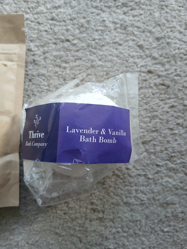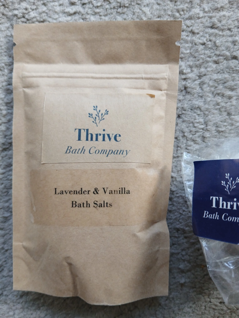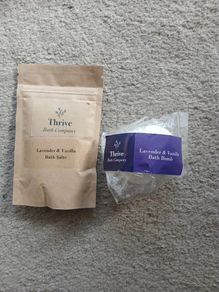 834Brand new, unused. Giftable (holidays, Christmas, birthdays, etc). Bath salts and bath bomb from Thrive bath company. Lavender and vanilla scented