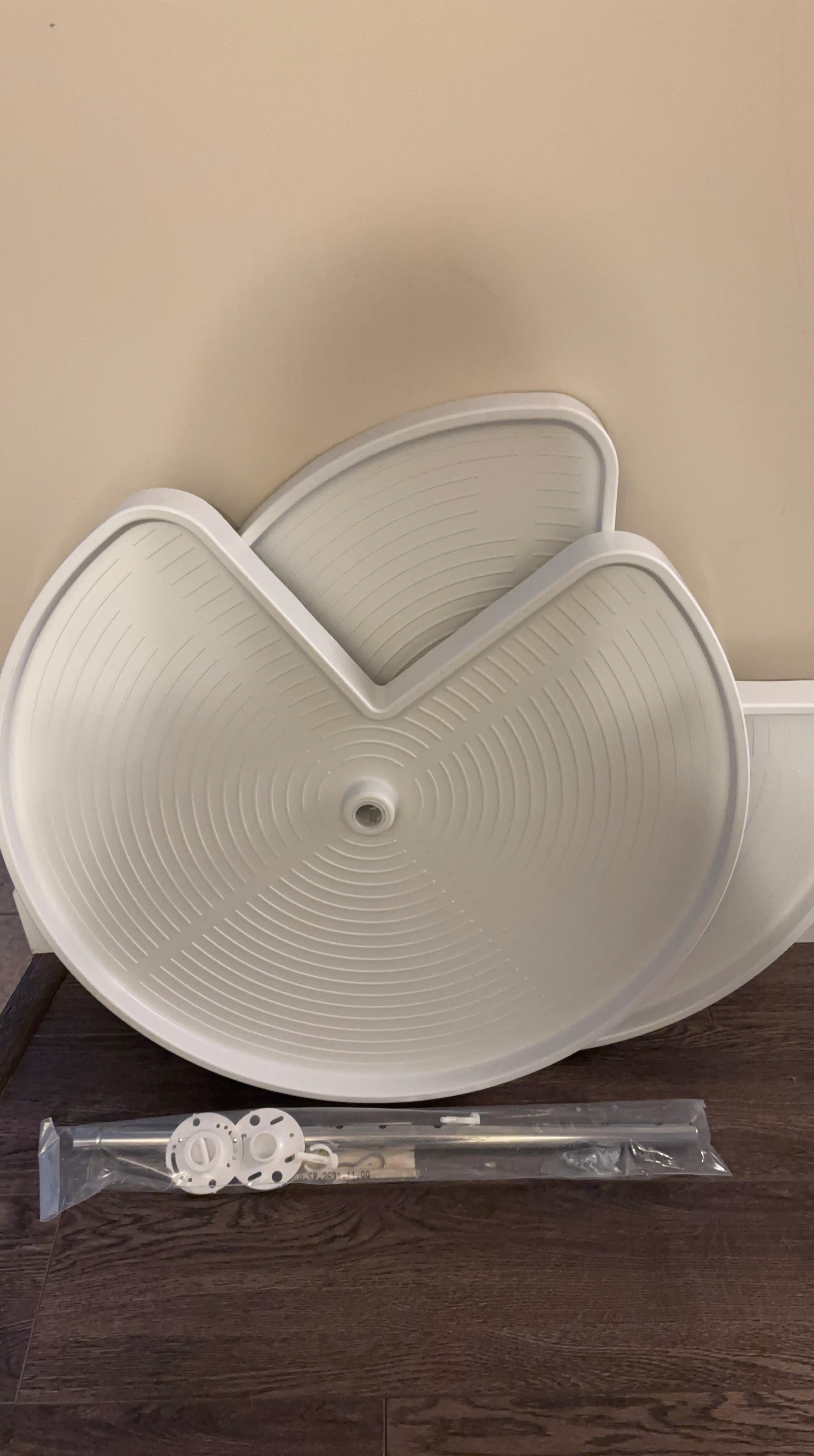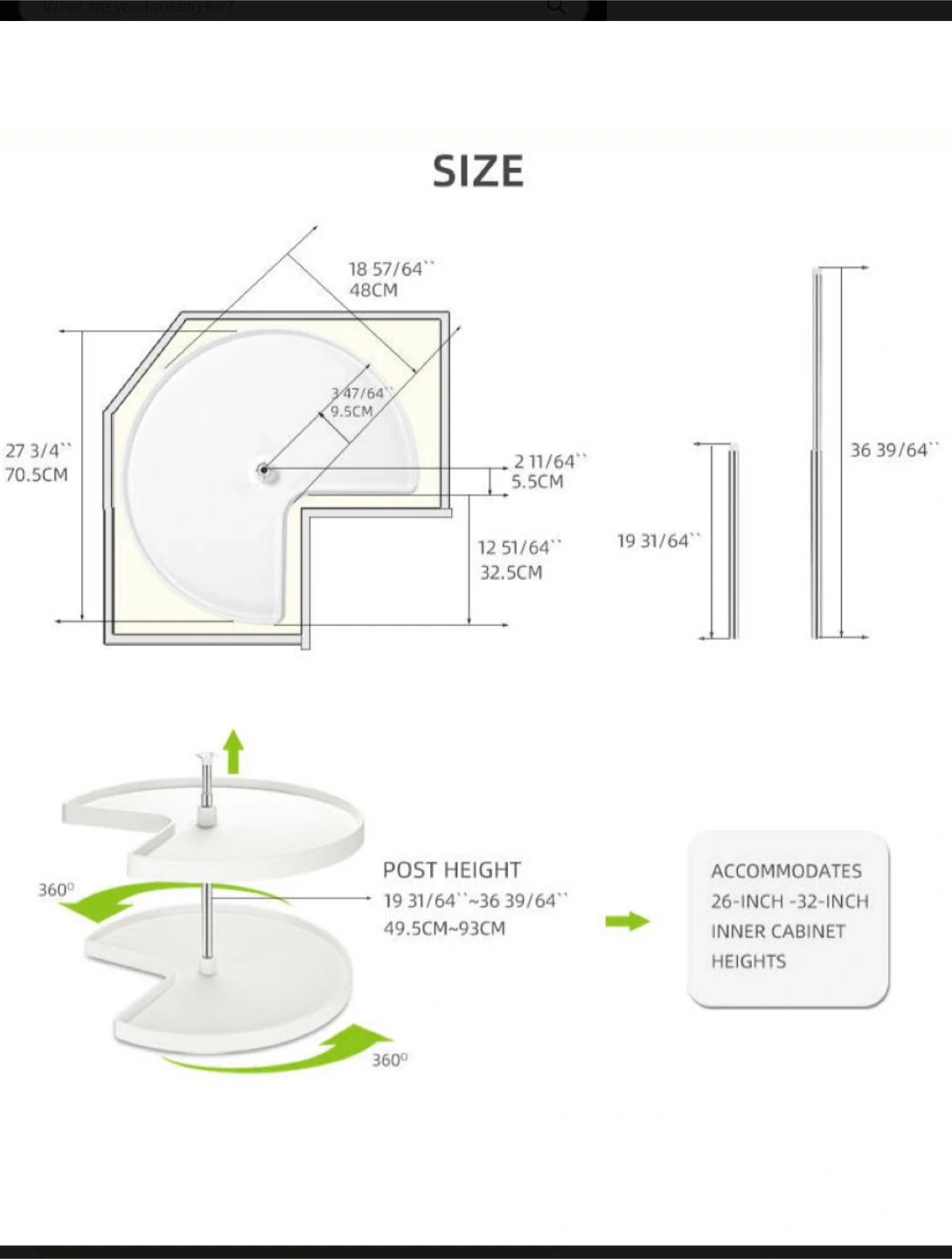 132Selling a Lazy Susan corner shelf set! It's perfect for organizing those hard-to-reach corners in your kitchen cabinets. The shelves are white and come with all the necessary hardware for installation. The dimensions are approximately 27 3/4" (70.5cm) at the widest point. The post height can be adjusted from 19 31/64" (49.5cm) to 36 39/64" (93cm) to accommodate different cabinet heights. It fits inner cabinet heights of 26-inch to 32-inch