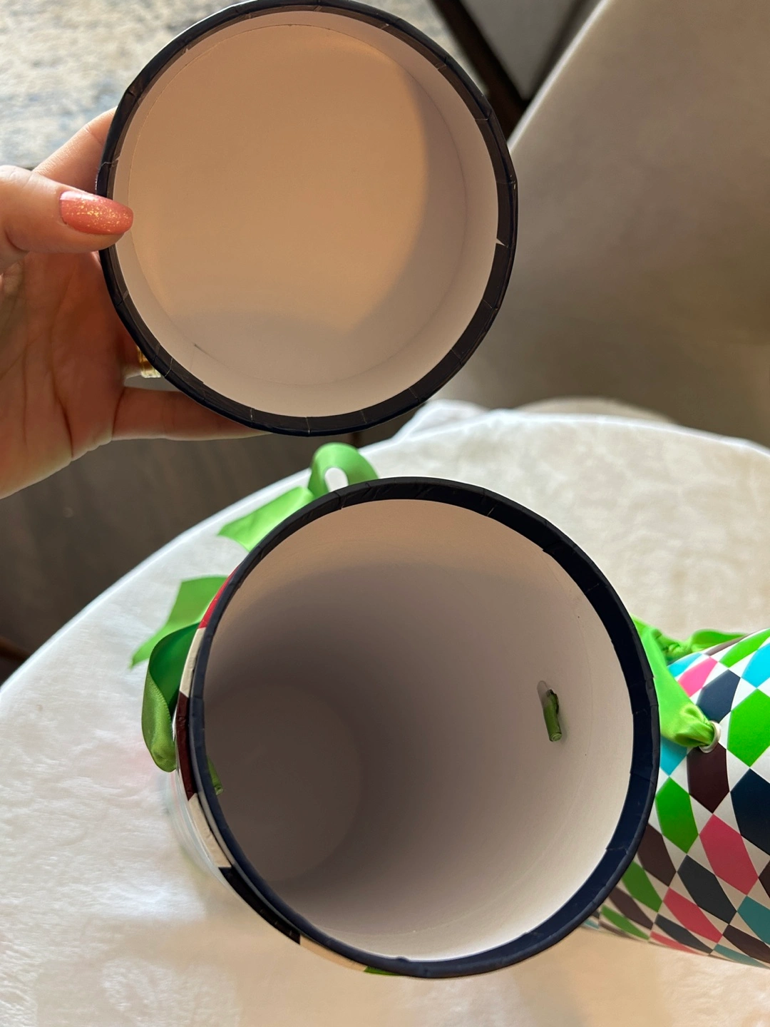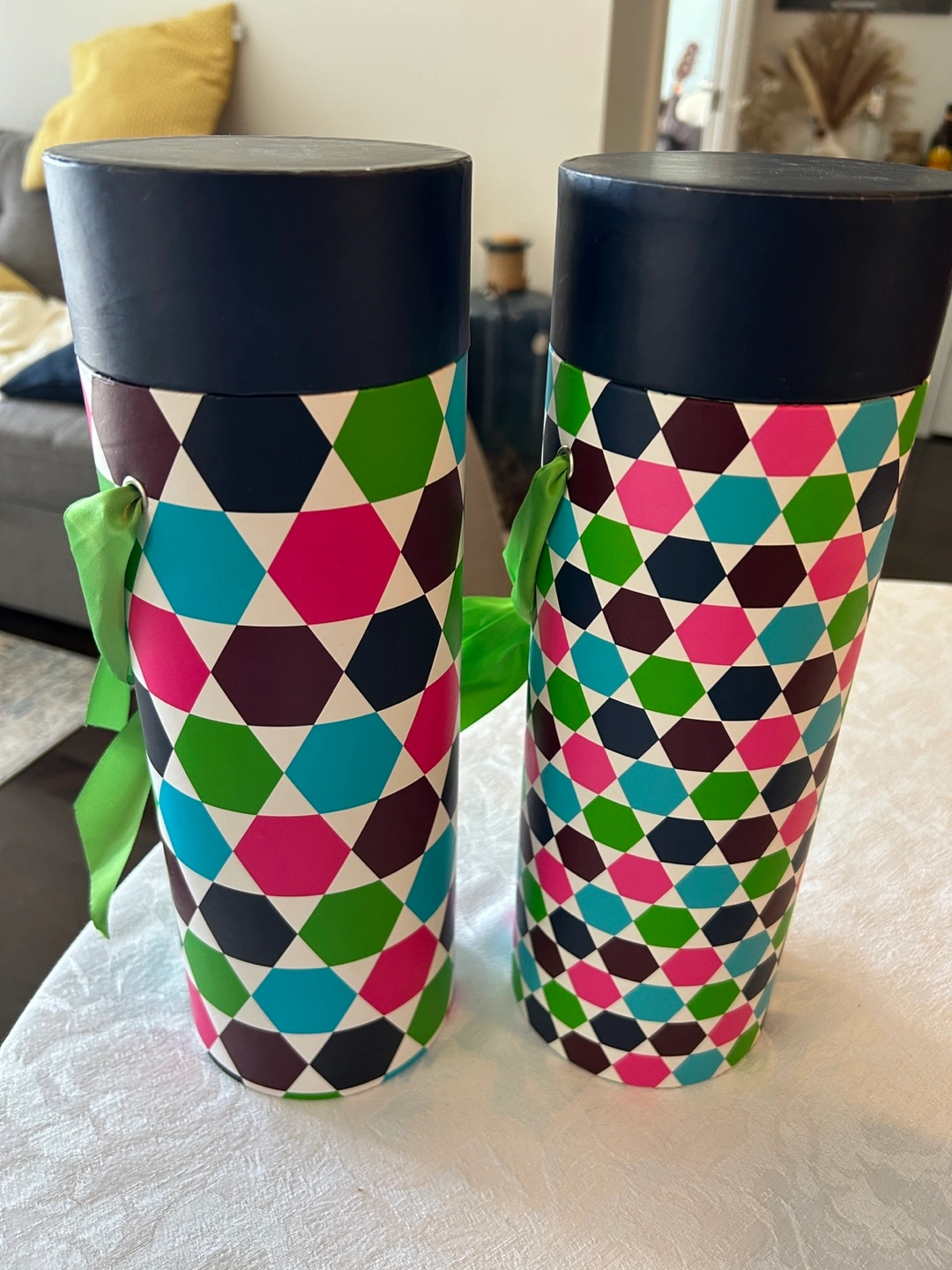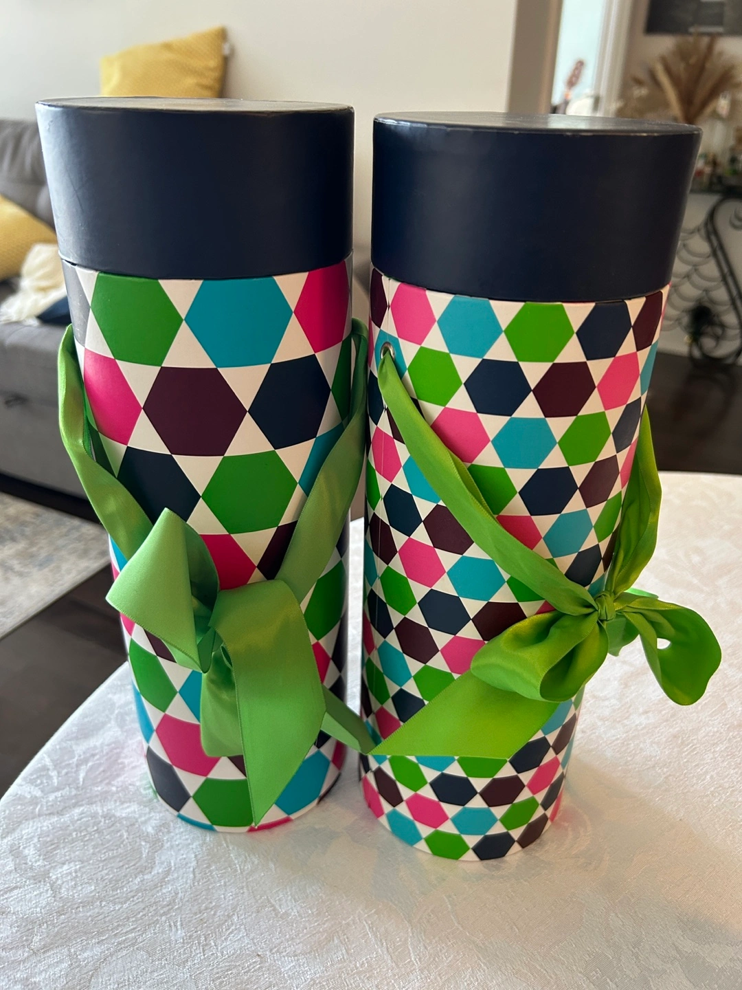 Pair of empty cylindrical gift boxes. Geometric pattern. Green ribbon accents. Perfect for gifting.