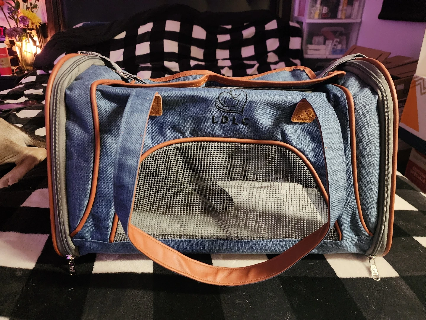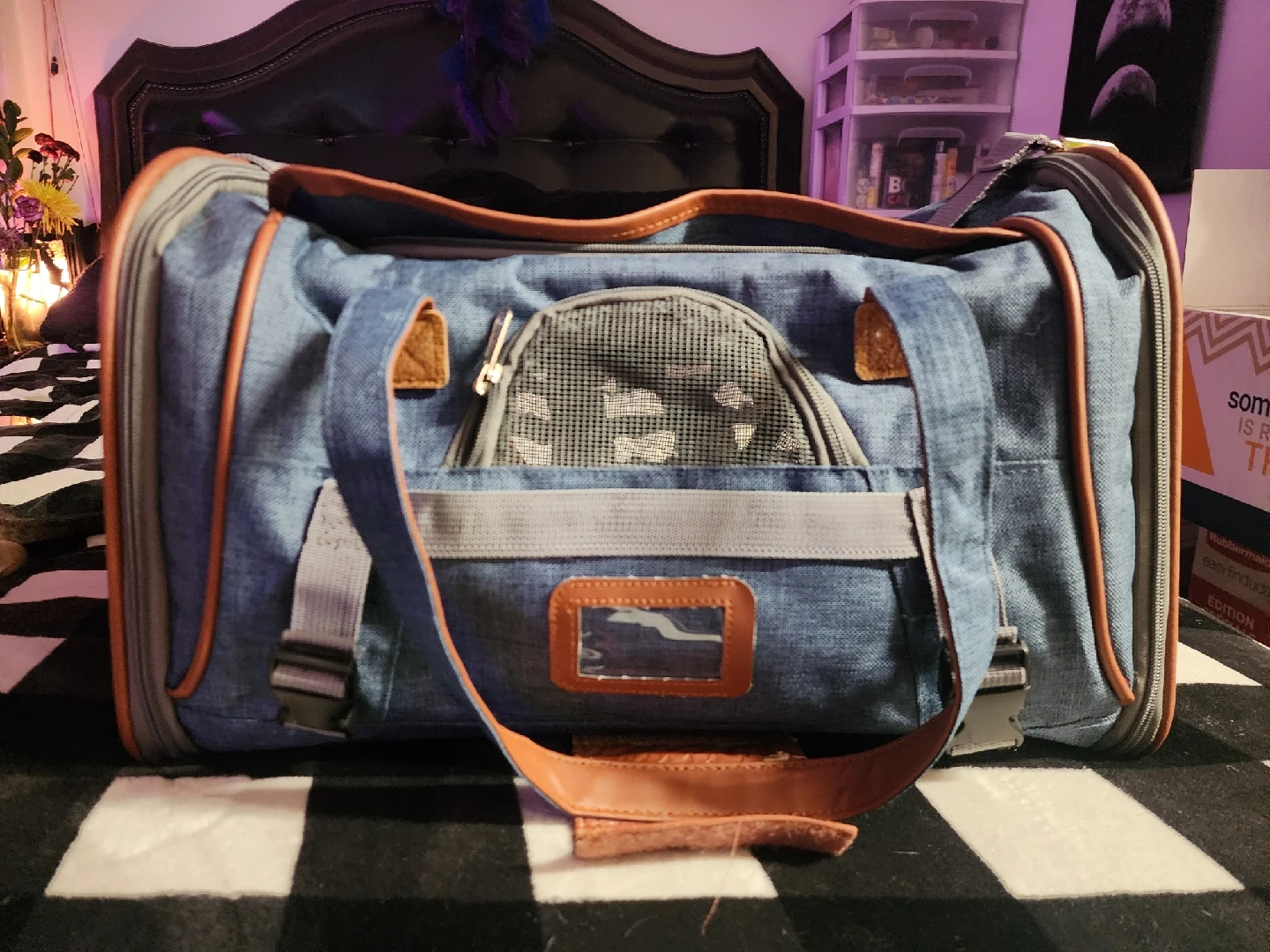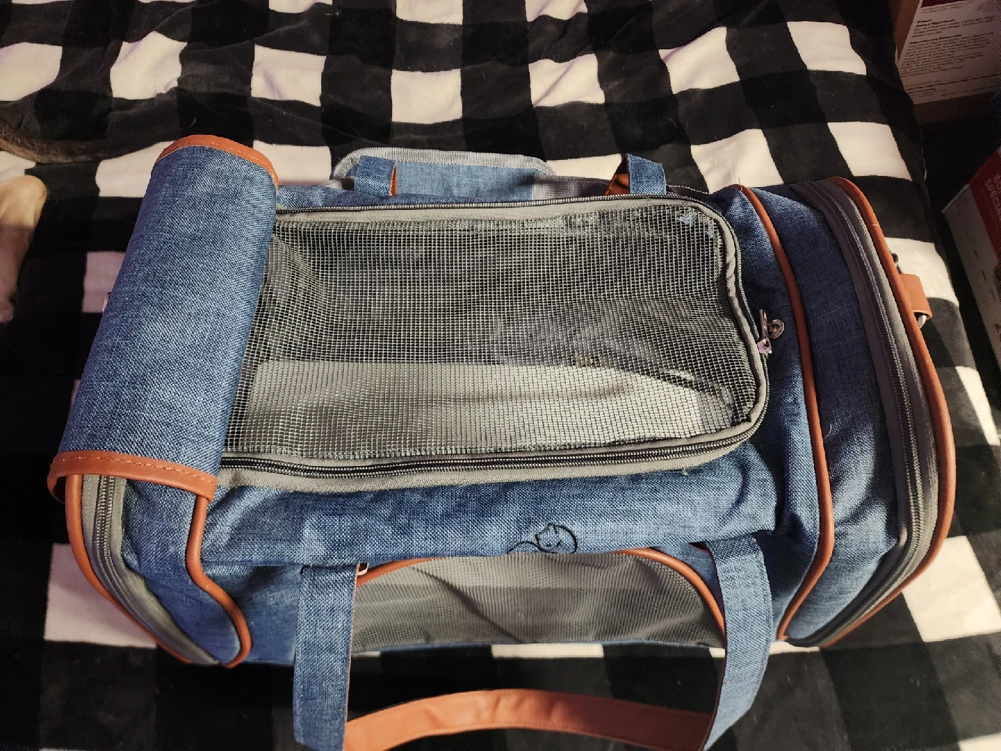 23Selling a denim pet carrier in great condition! It features mesh windows for ventilation and visibility, and a comfortable carrying strap. Perfect for vet visits or travel for your furry friend