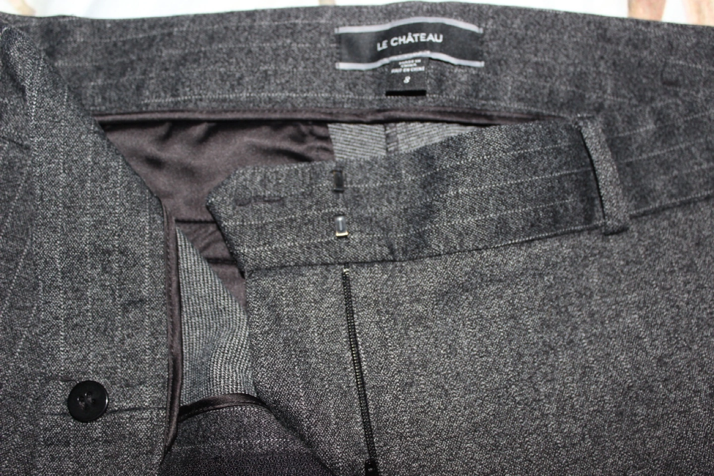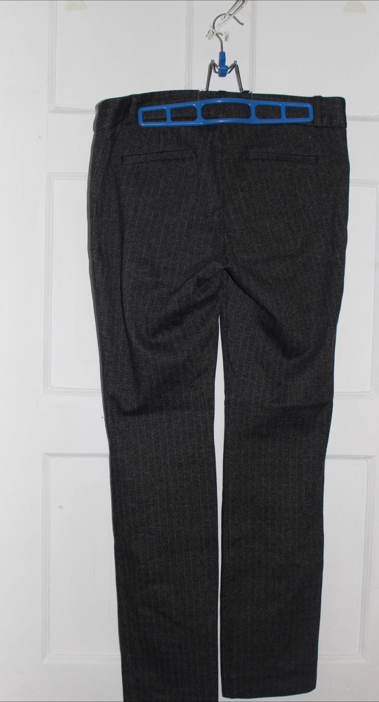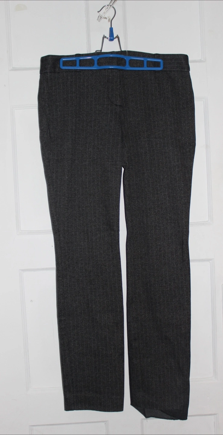 Here are some Le Chateau pants in a stylish grey pinstripe pattern. They are a size 8 and are in great condition. Perfect for work or a night out!