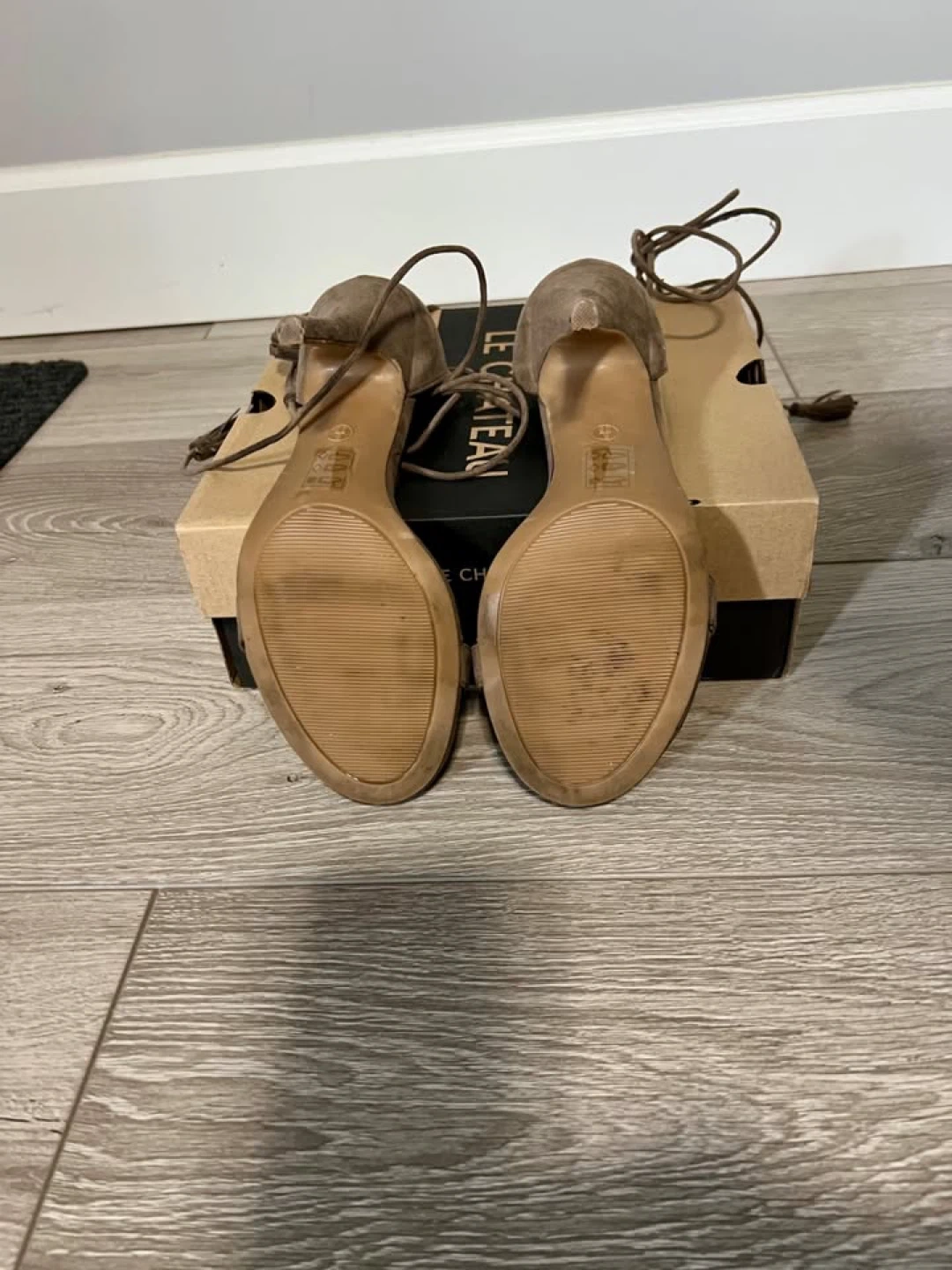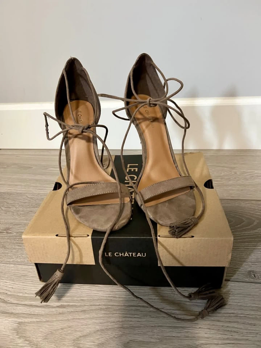 10These Le Chateau heels are in good condition and come in a size 8. They are a beautiful taupe colour and feature a stylish lace-up design with tassel details. The original box is included! Originally $79.95