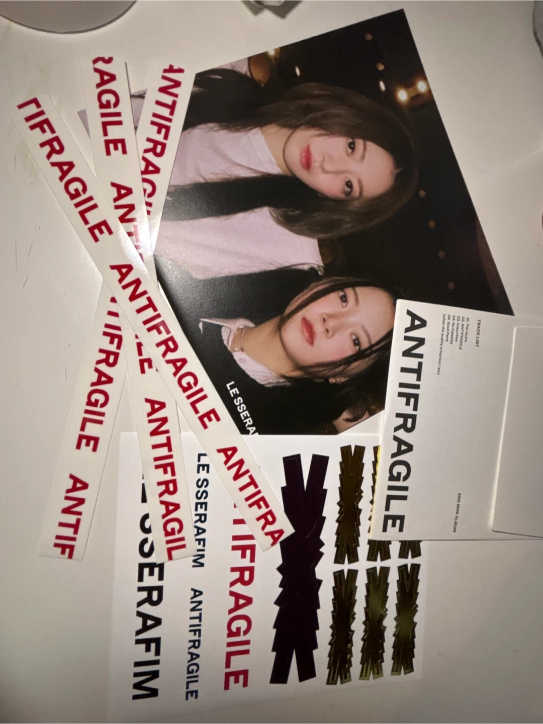Selling LE SSERAFIM's ANTIFRAGILE 2nd mini album! It comes with all the inclusions shown in the photos, including the album cover, track list, and stickers except a card