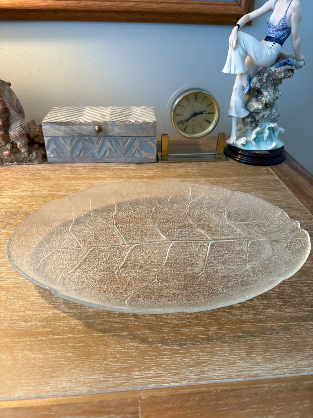 Selling a beautiful leaf-shaped glass serving platter. It's in great condition and would be perfect for serving appetizers or desserts at your next gathering! The intricate leaf design adds a touch of elegance to any table setting. Cash only