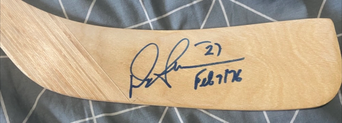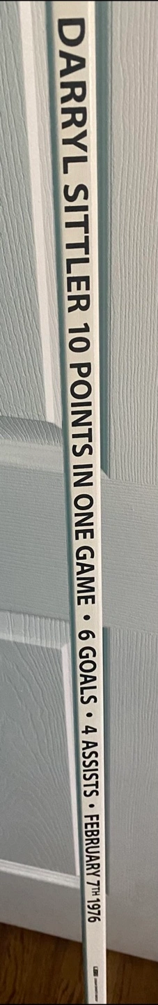 Darryl Sittler signed hockey stick. Commemorates his 10-point game. Features 6 goals and 4 assists.