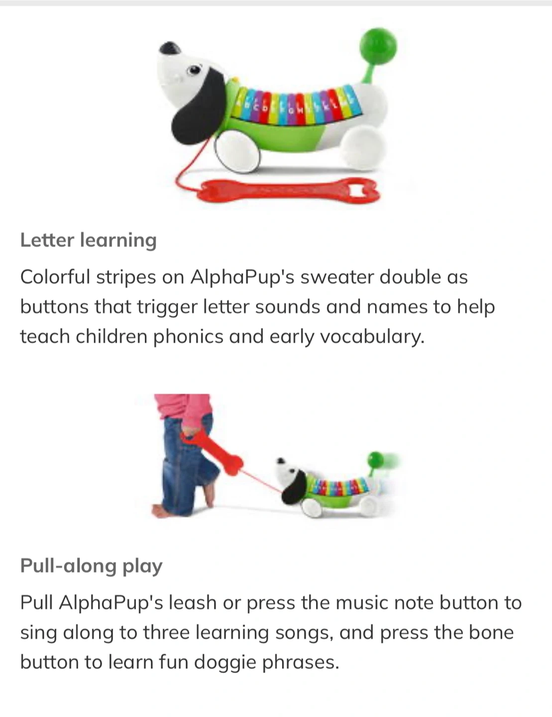 fun, interactive toy that helps kids learn their ABCs in FRENCH. The colorful stripes on AlphaPup's sweater act as buttons, triggering letter sounds and names to help with phonics and early vocabulary. Pick up only Cash only
