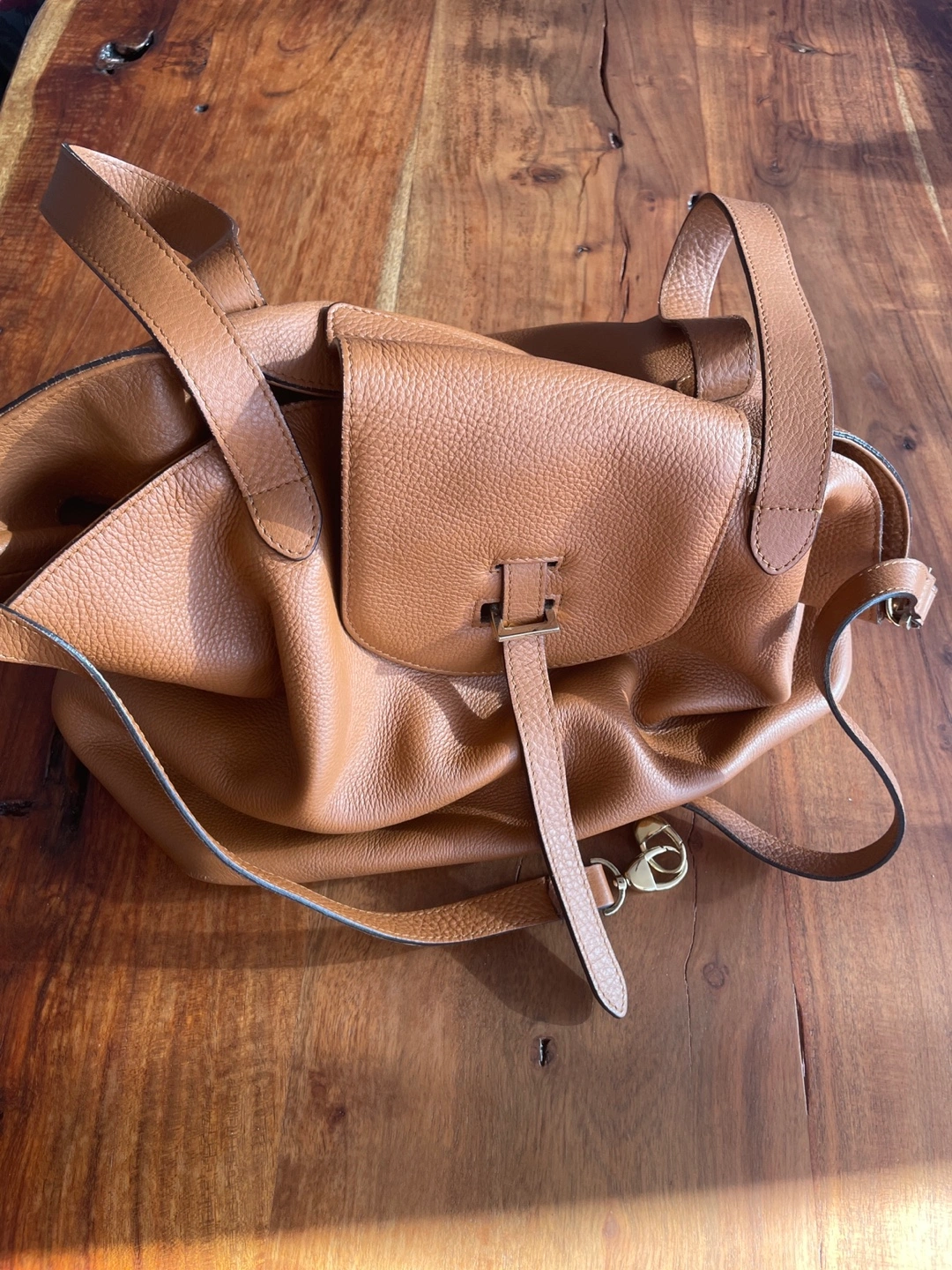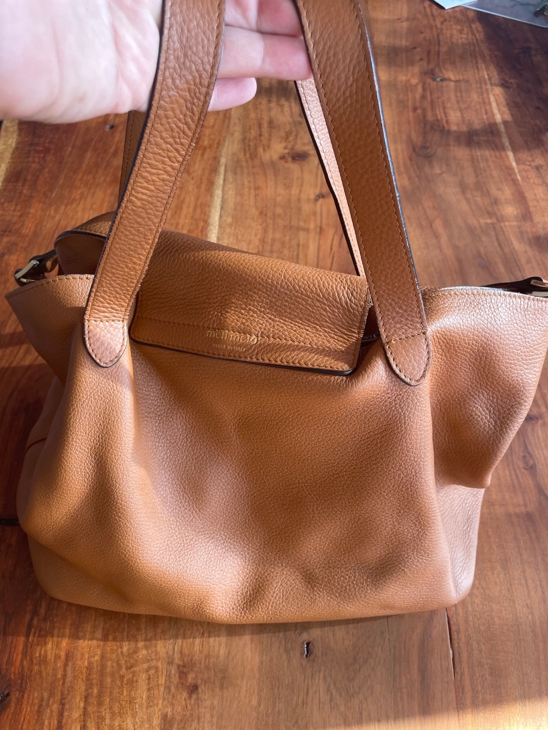 Beautiful camel leather bag. Features two top handles and a detachable shoulder strap. Inside pockets. Unique buckle closure. Leather made in Italy
