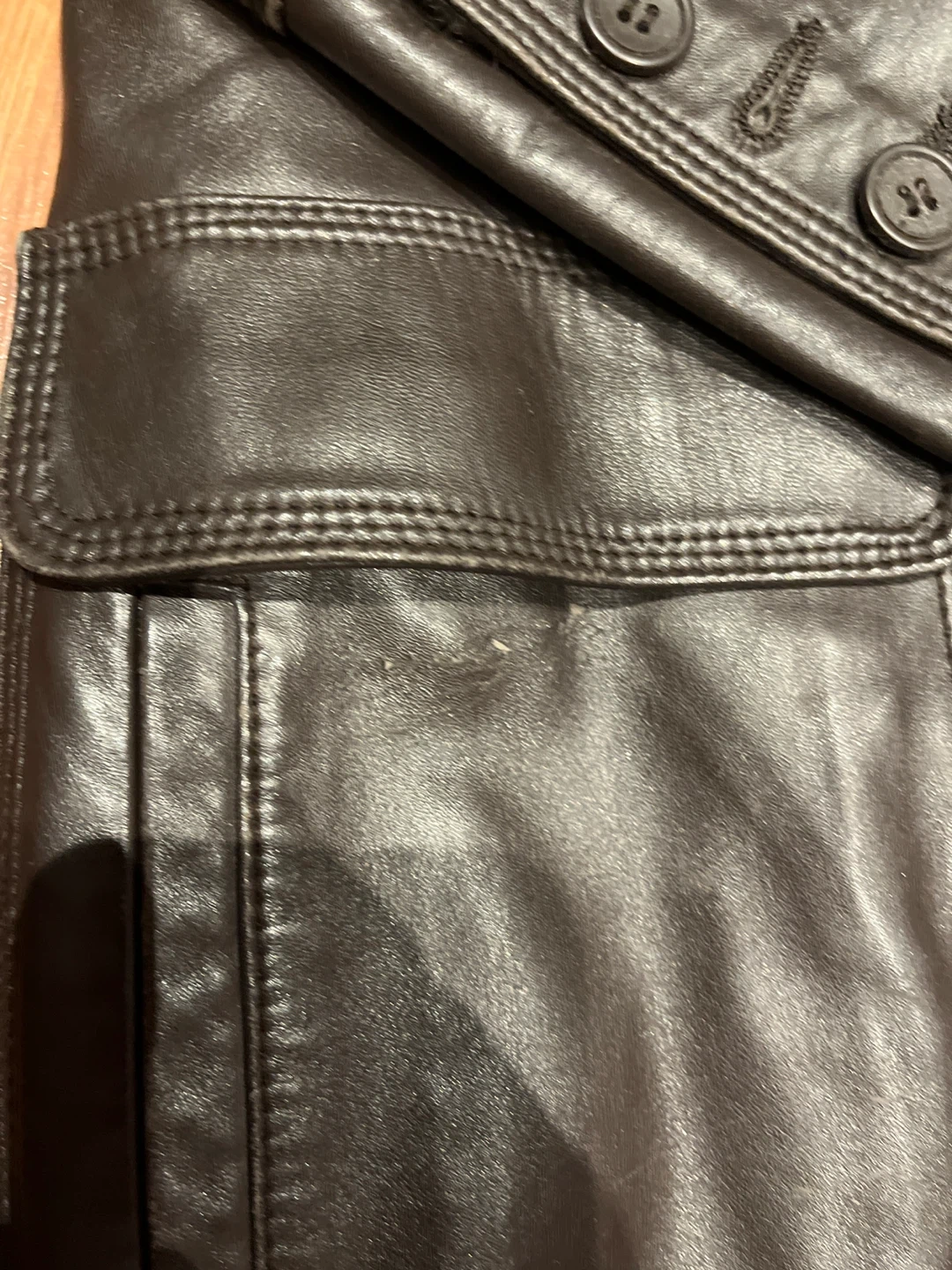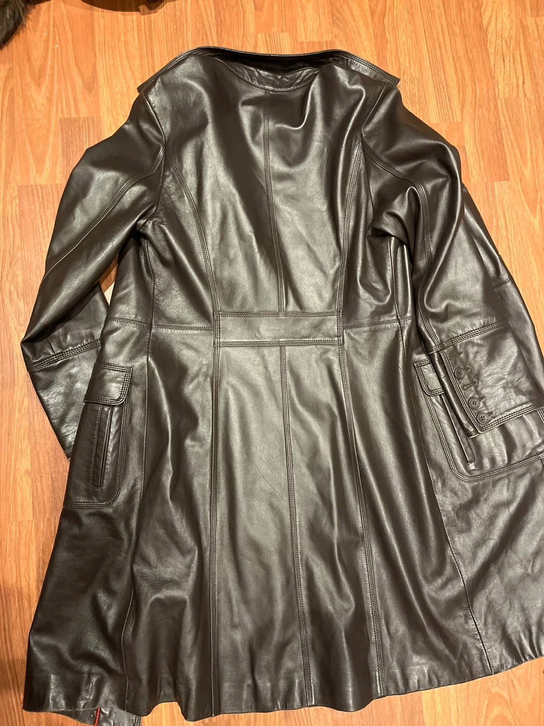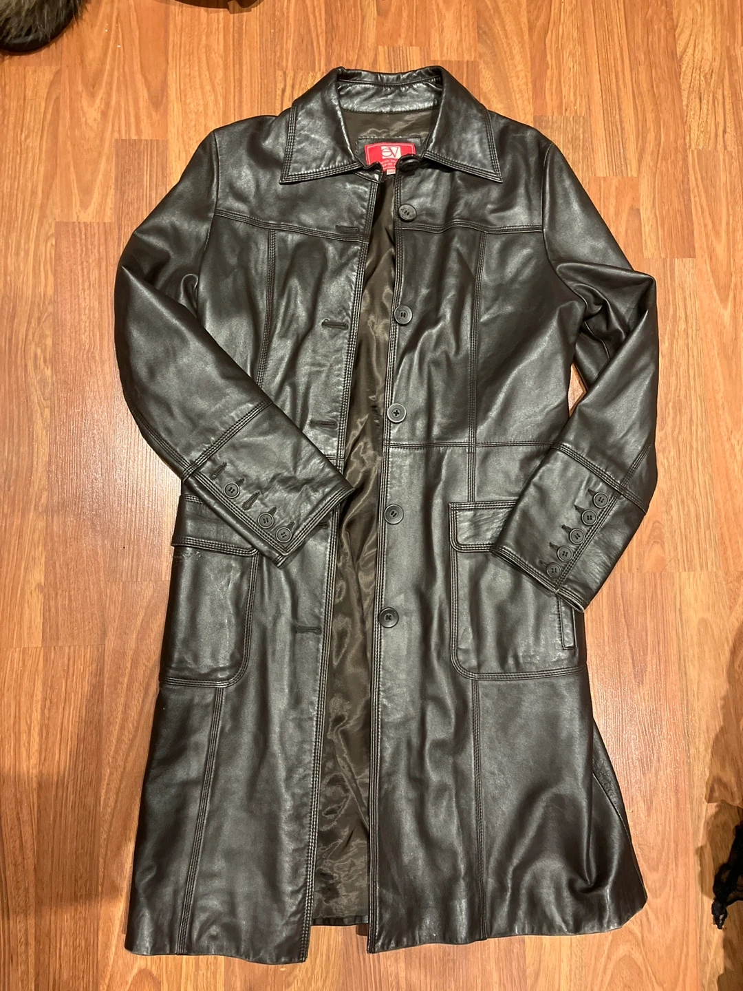 Selling a leather coat in a dark brown colour. The size is 165/84A. It's in good condition and ready for a new home! Slight scratch on side of coat. Fits like a size small. Meet up or pickup - message if interested Sold as is.