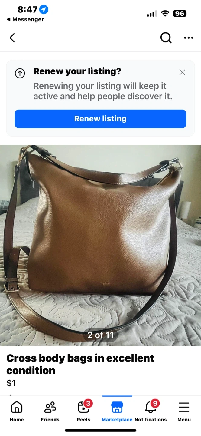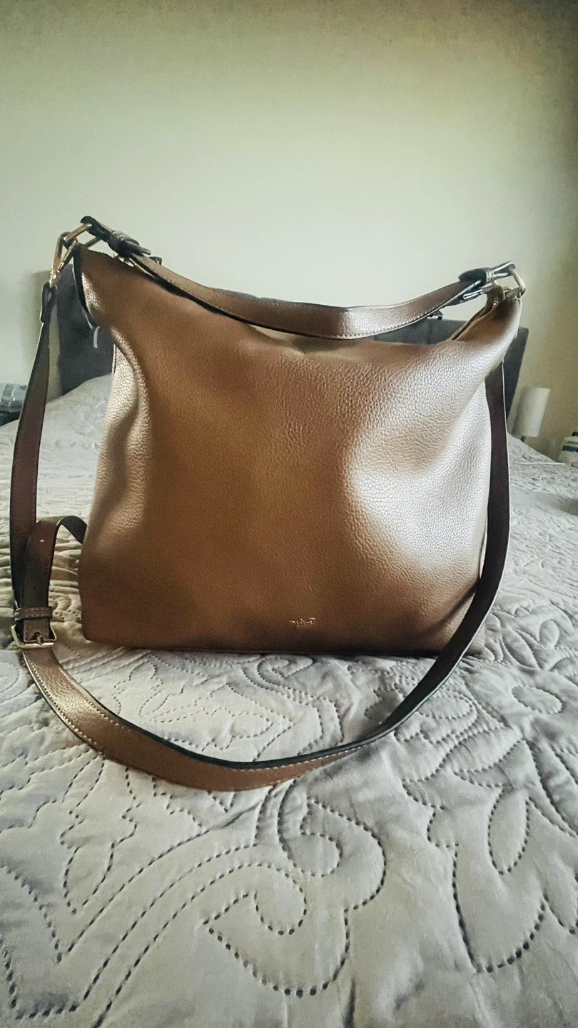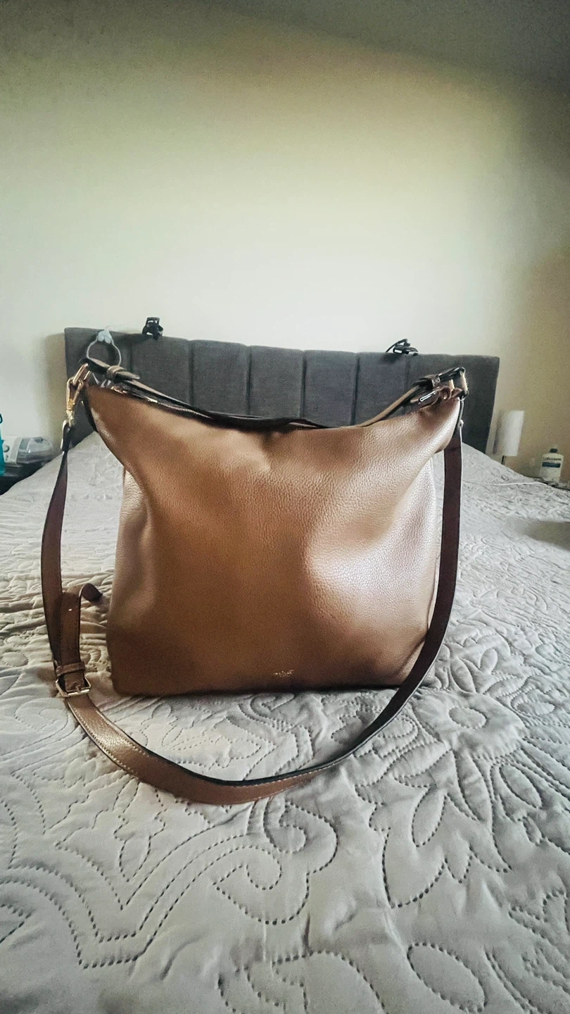 10Selling a lovely crossbody bag in excellent condition! It's a beautiful brown leather and perfect for everyday use. The bag has a zipper on the back for easy access to your belongings. It is a great size for carrying all of your essentials!
