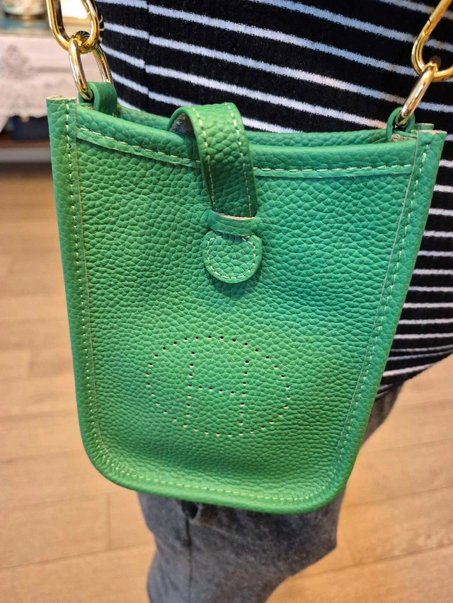 This is a used, bright green leather crossbody bag with gold hardware, perfect for adding a pop of colour to any outfit. It's compact yet spacious enough for your essentials, making it ideal for everyday use. Additional details: * Material: Genuine Leather * Colour: Bright Green * Hardware: Gold-tone * Style: Crossbody/Shoulder Bag * Closure: Open top with a secure tab I'm asking $150 for this fun bag.