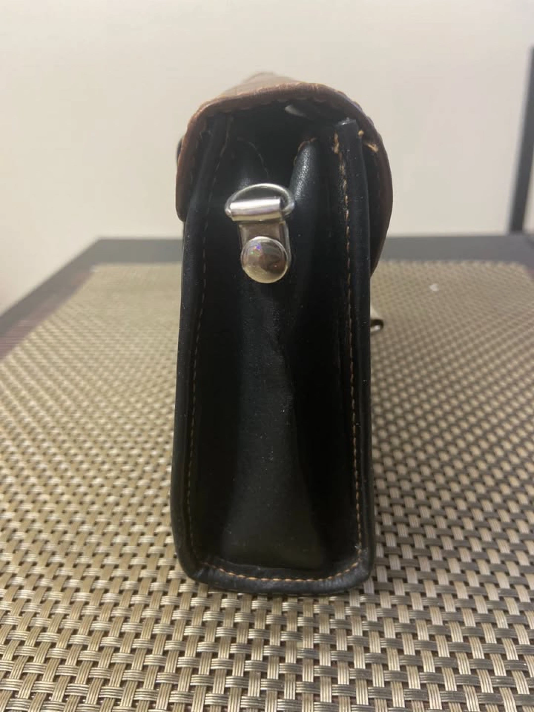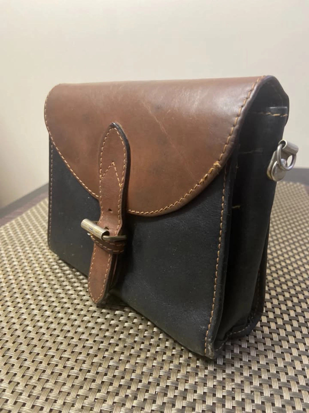Here is a two-tone leather crossbody bag. It has a brown flap and a black body. The bag has a strap, clasp and it opens to reveal a compartment. You can use this to comfortably carry your essentials.